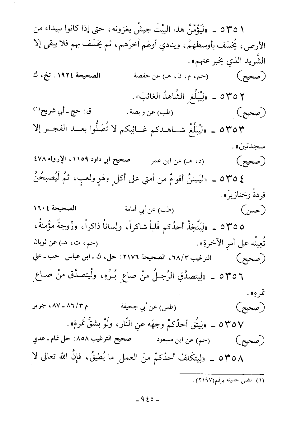 5351 - «ليؤمن هذا البيت جيش يغزونه حتى إذا كانوا ببيداء من الأرض يخسف بأوسطهم وينادي أولهم آخرهم ثم يخسف بهم فلا يبقى إلا الشريد الذي يخبر عنهم» .