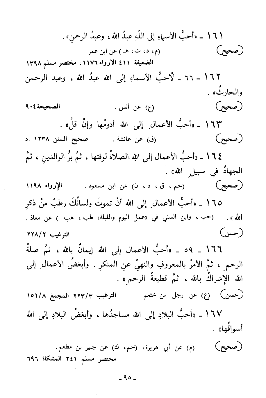166 - 95 - «أحب الأعمال إلى الله إيمان بالله ثم صلة الرحم ثم الأمر بالمعروف والنهي عن المنكر وأبغض الأعمال إلى الله الإشراك بالله ثم قطيعة الرحم» .
