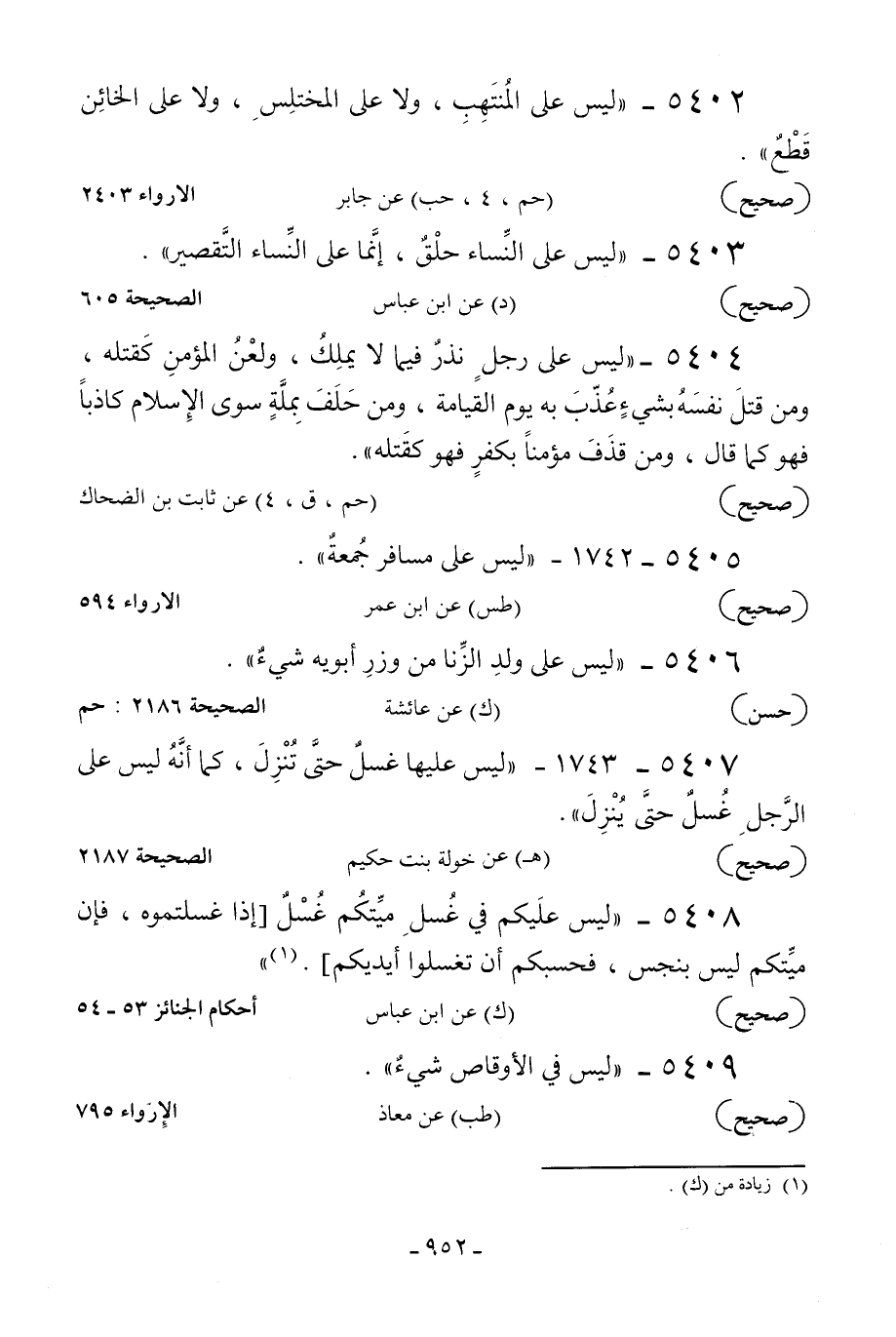5408 - «ليس عليكم في غسل ميتكم غسل إذا غسلتموه فإن ميتكم ليس بنجس فحسبكم أن تغسلوا أيديكم» 1.