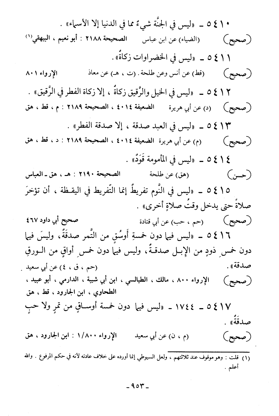 5416 - «ليس فيما دون خمسة أوسق من التمر صدقة وليس فيما دون خمس ذود من الإبل صدقة وليس فيما دون خمس أواق من الورق صدقة» ... [حم ق 4] عن أبي سعيد.