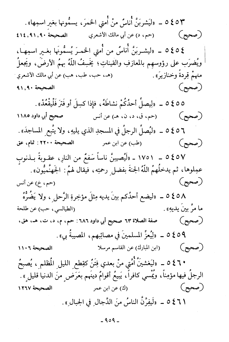 5454 - «ليشربن أناس من أمتي الخمر يسمونها بغير اسمها ويضرب على رءوسهم بالمعازف والقينات يخسف الله بهم الأرض ويجعل منهم قردة وخنازير» ... [هـ حب طب هب] عن أبي مالك الأشعري.