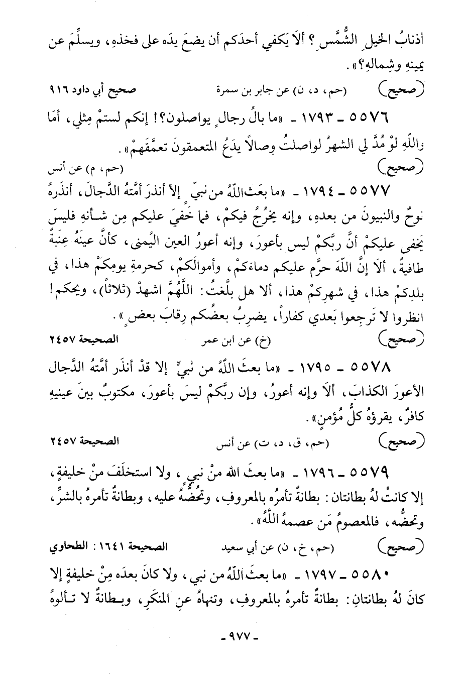 5578 - 1795 - «ما بعث الله من نبي إلا قد أنذر أمته الدجال الأعور الكذاب ألا وإنه أعور وإن ربكم ليس بأعور مكتوب بين عينيه كافر يقرؤه كل مؤمن» .