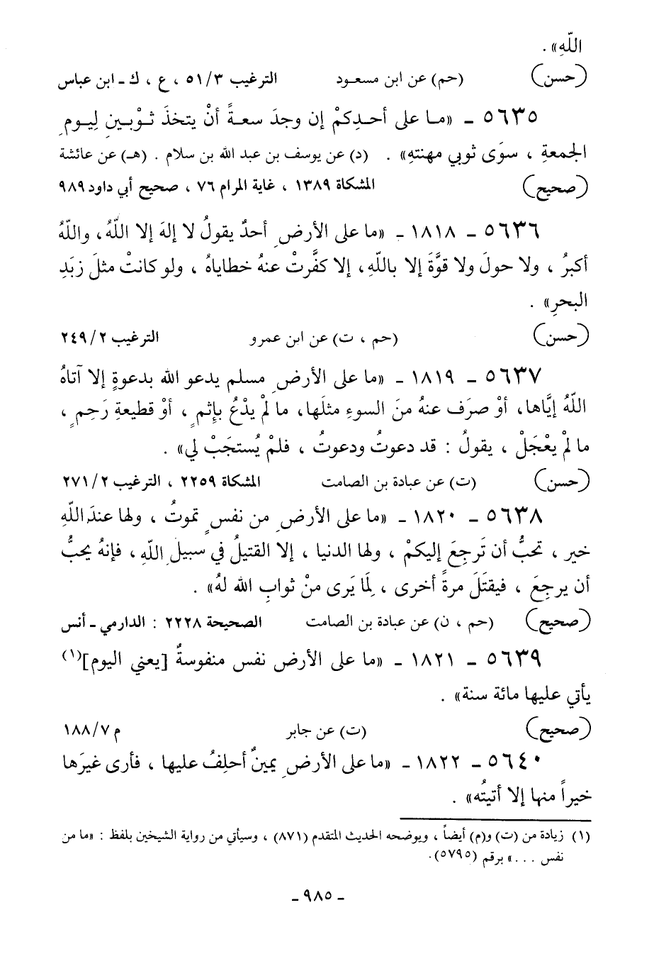 5636 - 1818 - «ما على الأرض أحد يقول لا إله إلا الله والله أكبر ولا حول ولا قوة إلا بالله إلا كفرت عنه خطاياه ولو كانت مثل زبد البحر» .