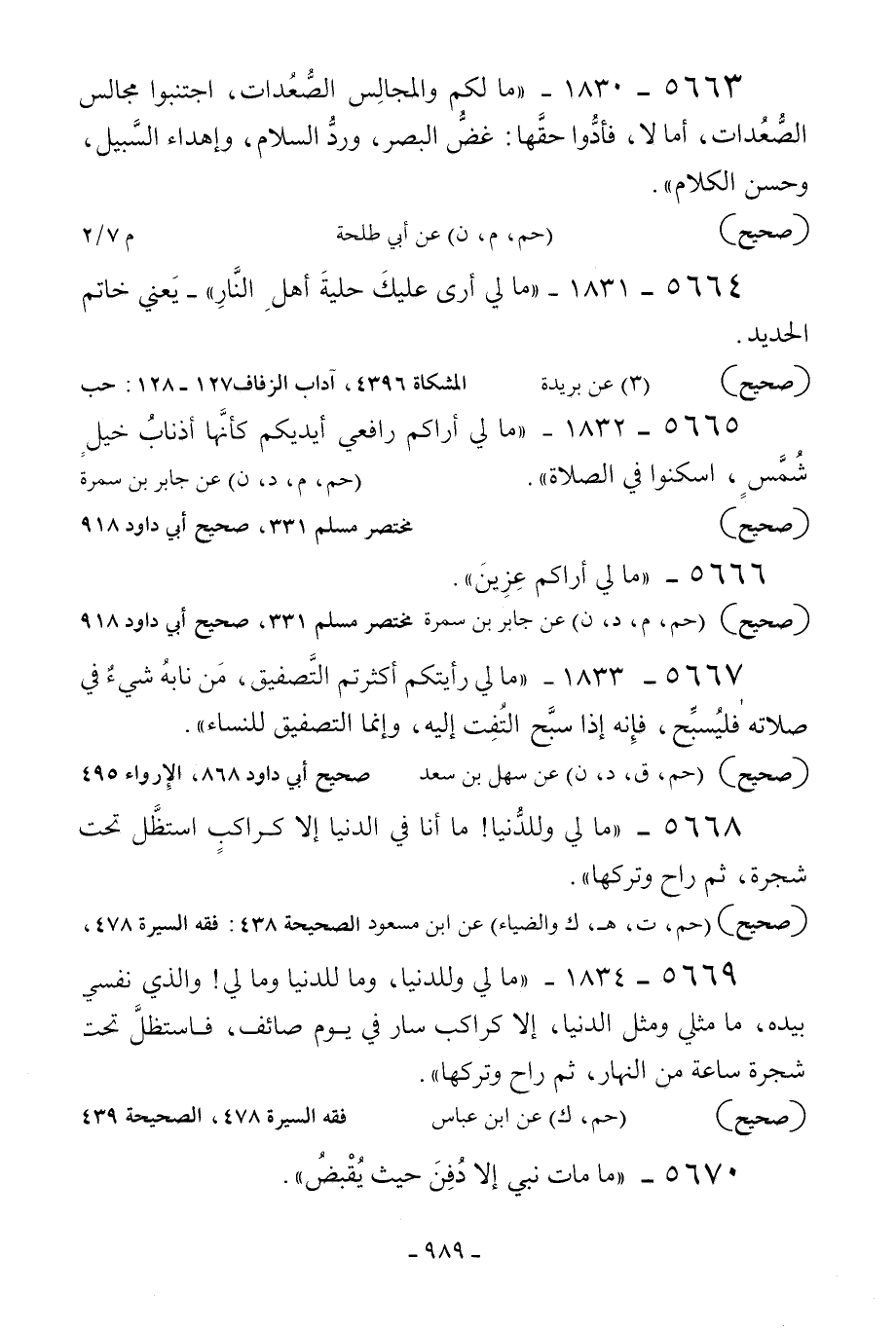 5669 - 1834 - «ما لي وللدنيا وما للدنيا وما لي! والذي نفسي بيده ما مثلي ومثل الدنيا إلا كراكب سار في يوم صائف فاستظل تحت شجرة ساعة من النهار ثم راح وتركها» .