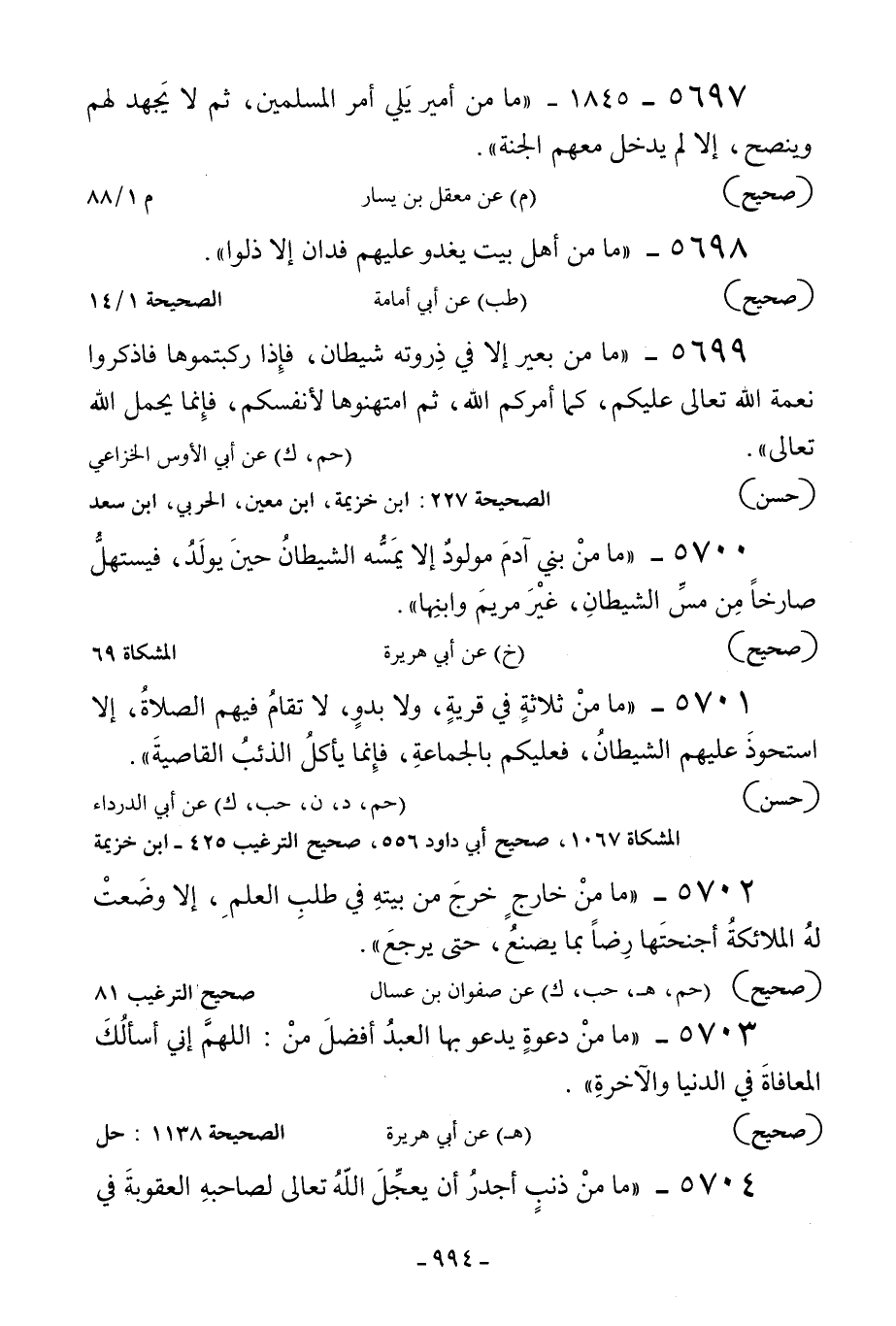 5701 - «ما من ثلاثة في قرية ولا بدولا تقام فيهم الصلاة إلا استحوذ عليهم الشيطان فعليكم بالجماعة فإنما يأكل الذئب القاصية» .