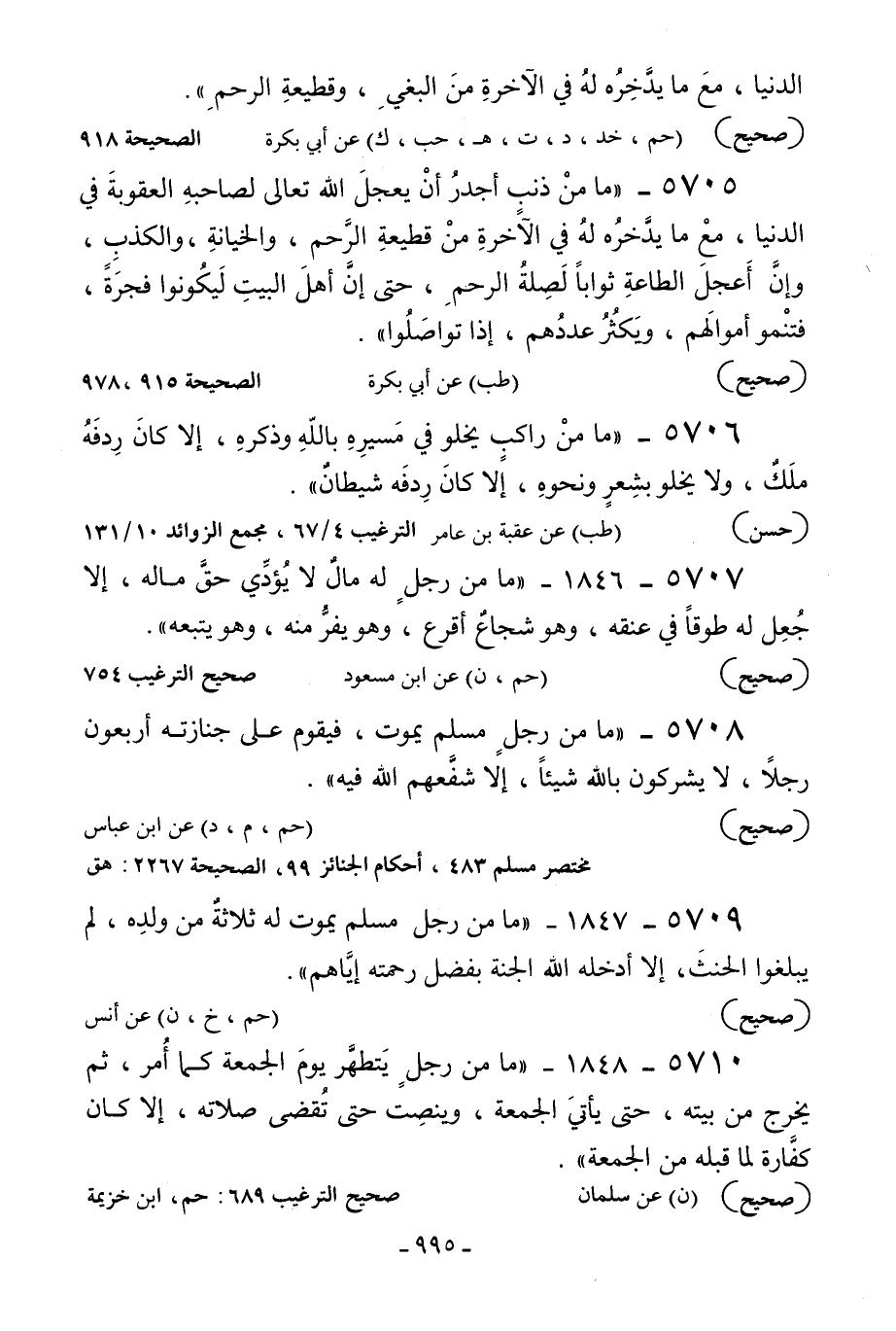5705 - «ما من ذنب أجدر أن يعجل الله تعالى لصاحبه العقوبة في الدنيا مع ما يدخره له في الآخرة من قطيعة الرحم والخيانة والكذب وإن أعجل الطاعة ثوابا لصلة الرحم حتى إن أهل البيت ليكونوا فجرة فتنموأموالهم ويكثر عددهم إذا تواصلوا» .