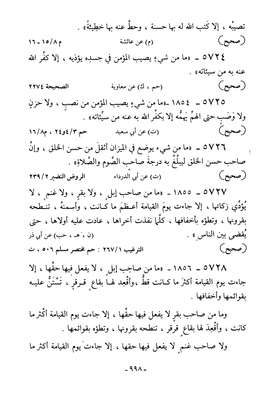 5724 - «ما من شيء يصيب المؤمن في جسده يؤذيه إلا كفر الله عنه به من سيئاته» .