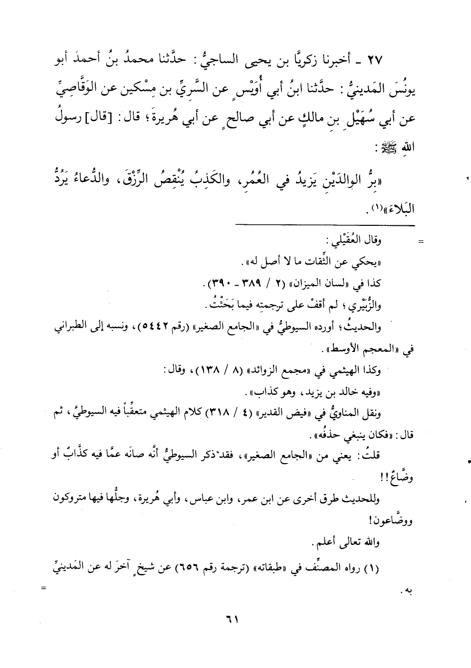 27 - أَخْبَرَنَا زَكَرِيَّا بْنُ يَحْيَى السَّاجِيُّ، حَدَّثَنَا مُحَمَّدُ بْنُ أَحْمَدَ أَبُو يُونُسَ الْمَدِينِيُّ، حَدَّثَنَا ابْنُ أَبِي أُوَيْسٍ، عَنِ السَّرِيِّ بْنِ مِسْكِينٍ، عَنِ الْوَقَّاصِيِّ، عَنْ أَبِي سُهَيْلِ بْنِ مَالِكٍ، عَنْ أَبِي صَالِحٍ، عَنْ أَبِي هُرَيْرَةَ قَالَ: قَالَ رَسُولُ اللَّهِ صَلَّى اللَّهُ عَلَيْهِ وَسَلَّمَ: «§بِرُّ الْوَالِدَيْنِ يَزِيدُ فِي الْعُمُرِ، وَالْكَذِبُ يَنْقُصُ الرِّزْقَ، وَالدُّعَاءُ يَرُدُّ الْبَلَاءَ»