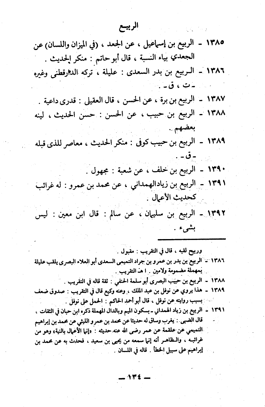 1385 - الربيع بن إسماعيل: عن الجعد، في الميزان واللسان عن الجعدي بياء النسبة، قال أبو حاتم: منكر الحديث.