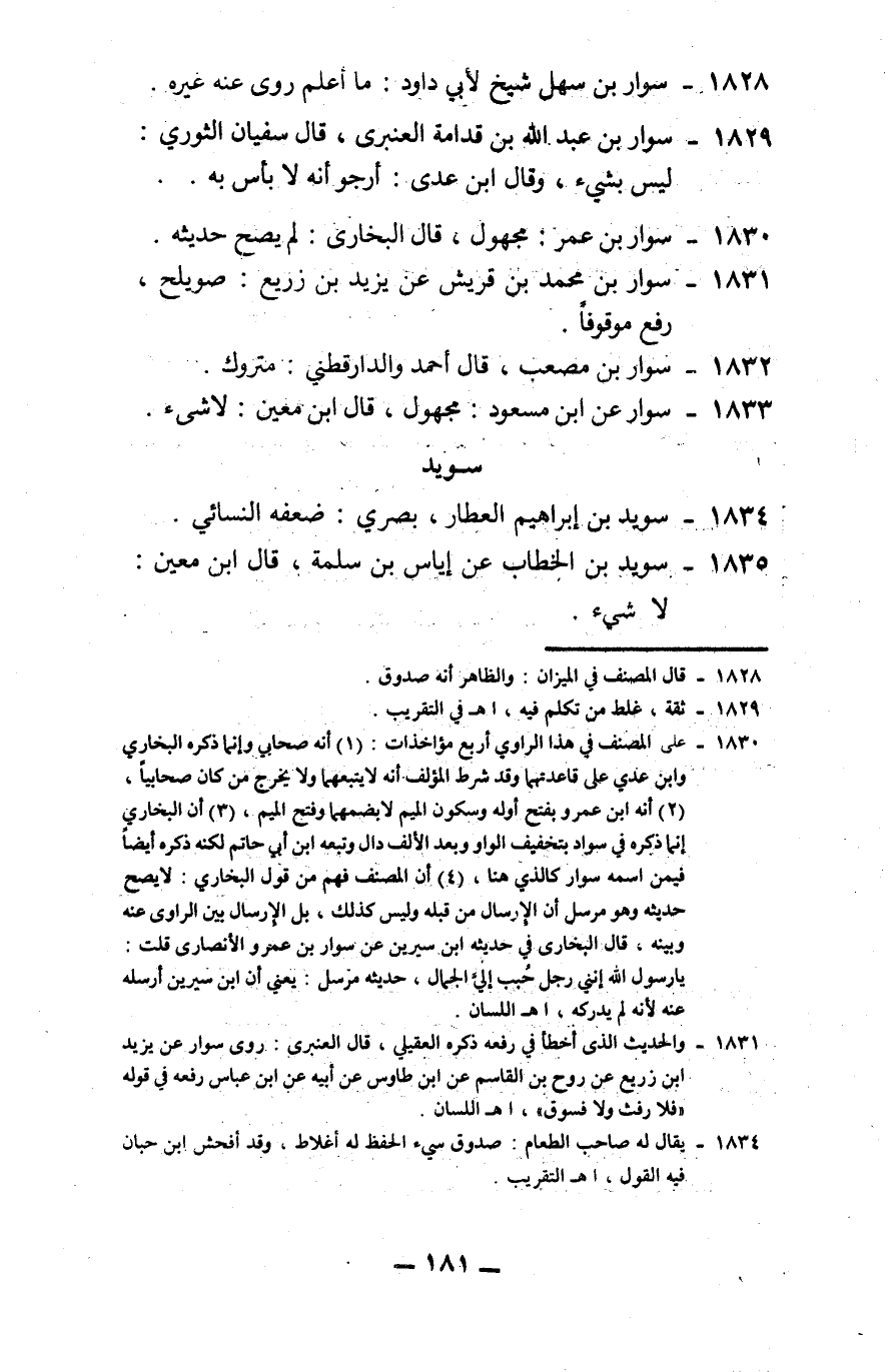 1829 - سوار بن عبد الله بن قدامة العنبري: قال سفيان الثوري: ليس بشيء، وقال ابن عدي: أرجو أنه لا بأس به.