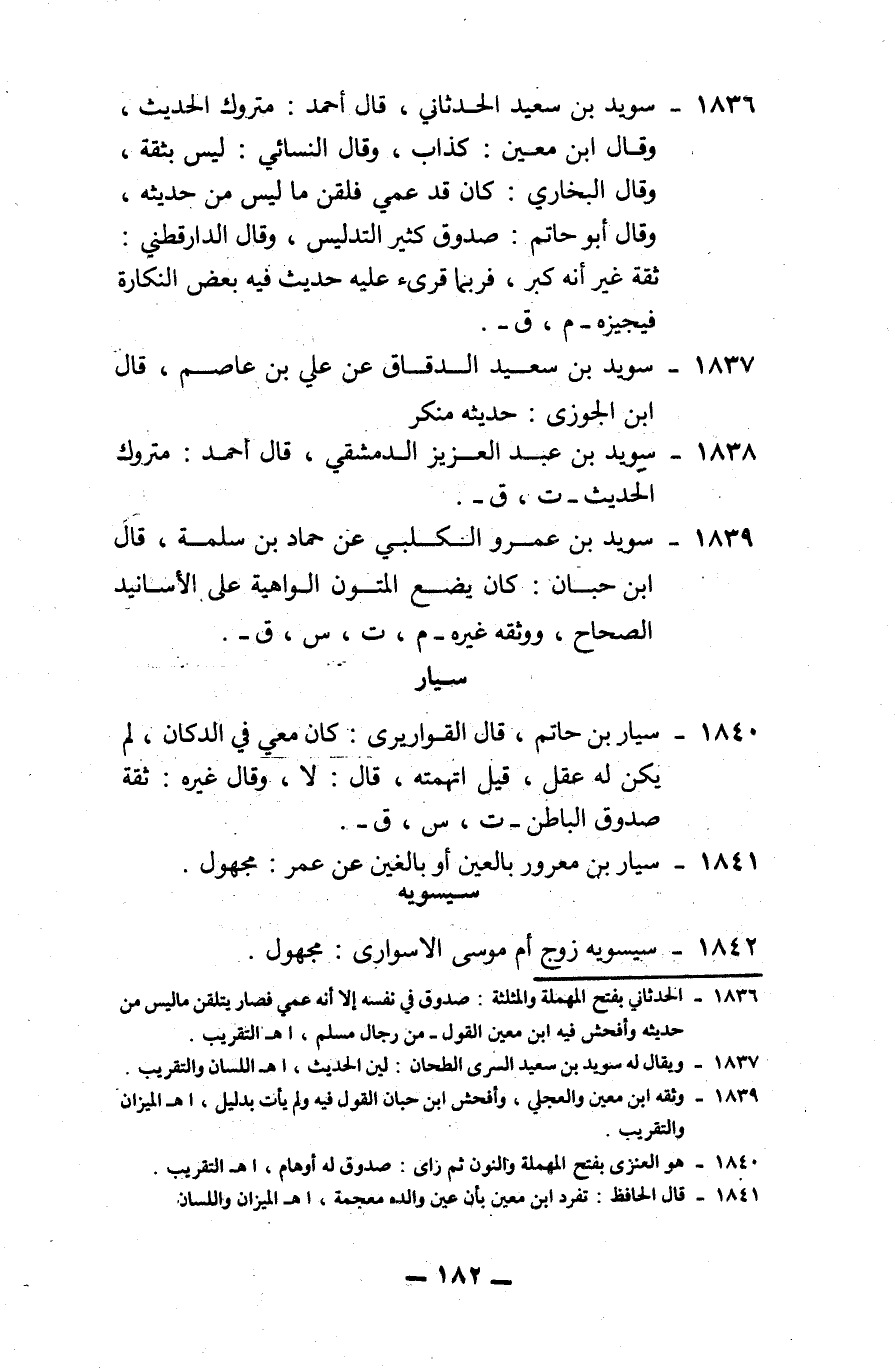 1836 - سويد بن سعيد الحدثاني: قال أحمد: متروك الحديث، وقال ابن معين: كذاب، وقال النسائي: ليس بثقة، وقال البخاري: كان قد عمي فلقن ما ليس من حديثه، وقال أبو حاتم: صدوق كثير التدليس، وقال الدارقطني: ثقة غير أنه كبر، فربما قرئ عليه حديث فيه بعض النكارة فيجيزه. -م، ق-
