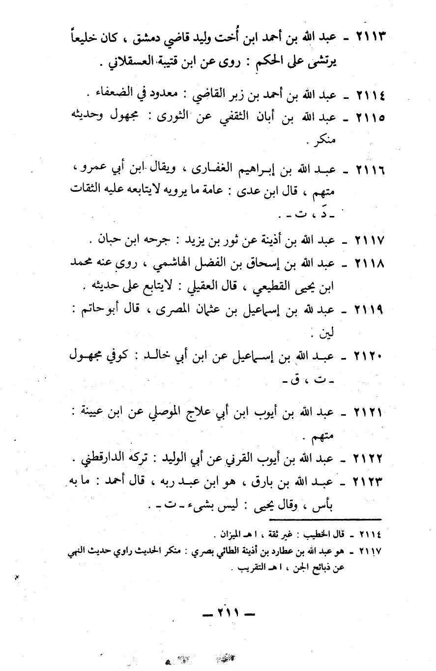 2113 - عبد الله بن أحمد: ابن أخت وليد، قاضي دمشق، كان خليعاً يرتشي على الحكم، روى عن ابن قتيبة العسقلاني.