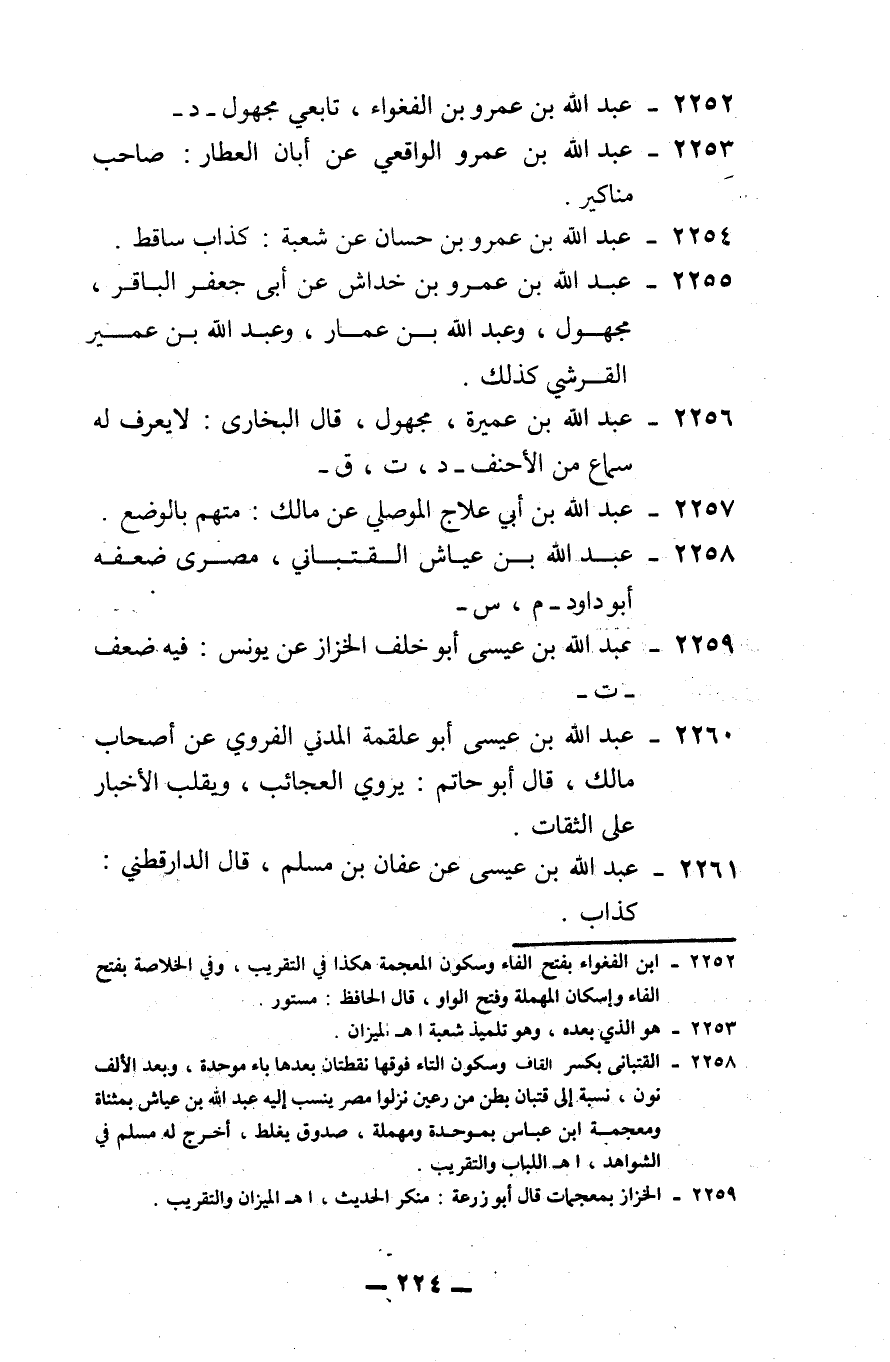 2255 - عبد الله بن عمرو بن خداش: عن أبي جعفر الباقر، مجهول، وعبد الله بن عمار، وعبد الله بن عمير القرشي كذلك.