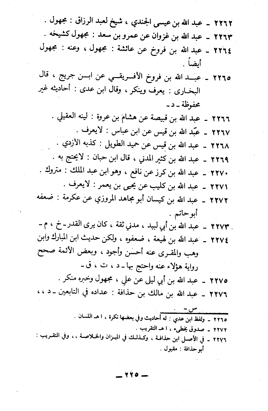 2265 - عبد الله بن فروخ الإفريقي: عن ابن جريج، قال البخاري: يعرف وينكر، وقال ابن عدي: أحاديثه غير محفوظة. -د-