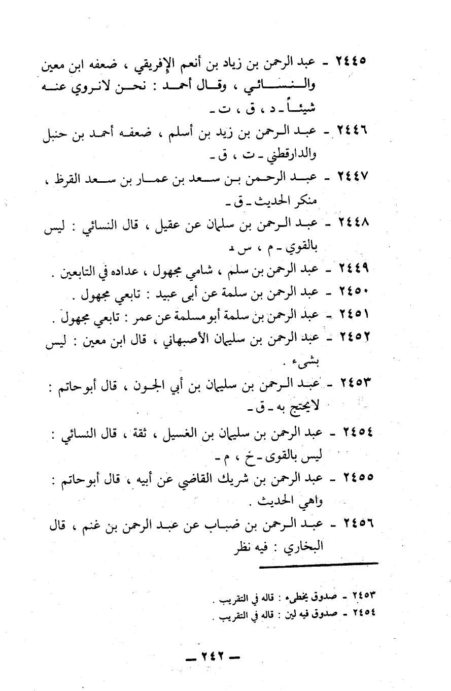2445 - عبد الرحمن بن زياد بن أنعم الإفريقي: ضعفه ابن معين، والنسائي، وقال أحمد: نحن لا نروي عنه شيئاً. -د، ق، ت-