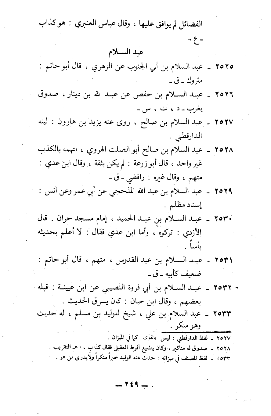2530 - عبد السلام بن عبد الحميد: إمام مسجد حران، قال الأزدي: تركوه، وأما ابن عدي فقال: لا أعلم بحديثه بأساً.