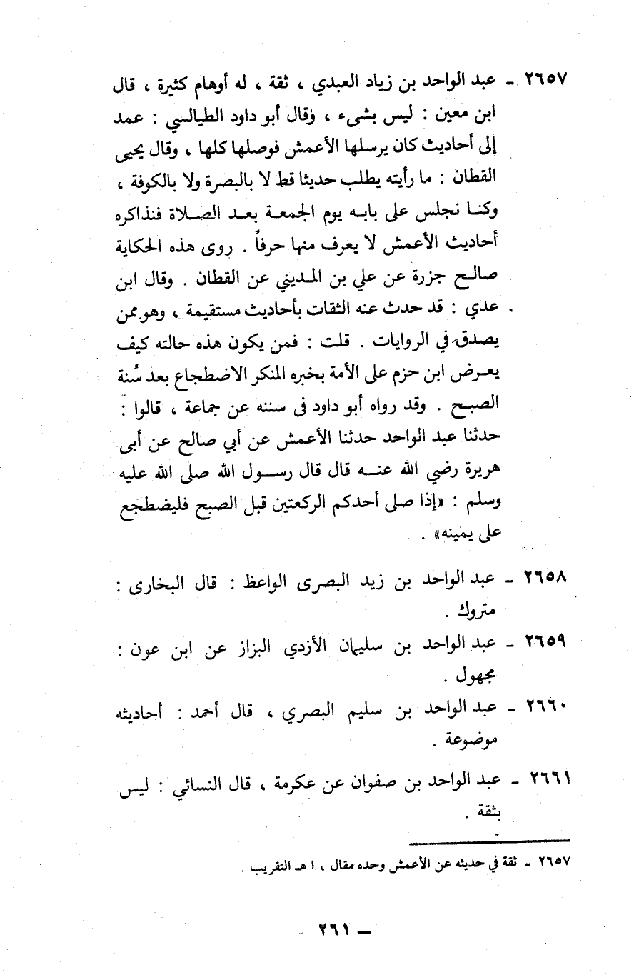 2657 - عبد الواحد بن زياد العبدي: ثقة، له أوهام كثيرة، قال ابن معين: ليس بشيء، وقال أبو داود الطيالسي: عمد إلى أحاديث كان يرسلها الأعمش فوصلها كلها، وقال يحيى القطان: ما رأيته يطلب حديثاً قط لا بالبصرة ولا بالكوفة، وكنا نجلس على بابه يوم الجمعة بعد الصلاة فنذاكره أحاديث الأعمش لا يعرف منها حرفاً، روى هذه الحكاية صالح جزرة، عن علي بن المديني عن القطان. وقال ابن عدي: قد حدث عنه الثقات بأحاديث مستقيمة، وهو ممن يصدق في الروايات. قلت: فمن يكون هذه حالته كيف يعرض ابن حزم على الأمة بخبره المنكر الاضجاع بعد سنة الصبح. وقد رواه أبو داود في سننه عن جماعة قالوا: حدثنا عبد الواحد، حدثنا الأعمش عن أبي صالح عن أبي هريرة رضي الله عنه قال: قال رسول الله - صلى الله عليه وآله وسلم -: «إذا صلى أحدكم الركعتين قبل الصبح فليضطجع على يمينه».