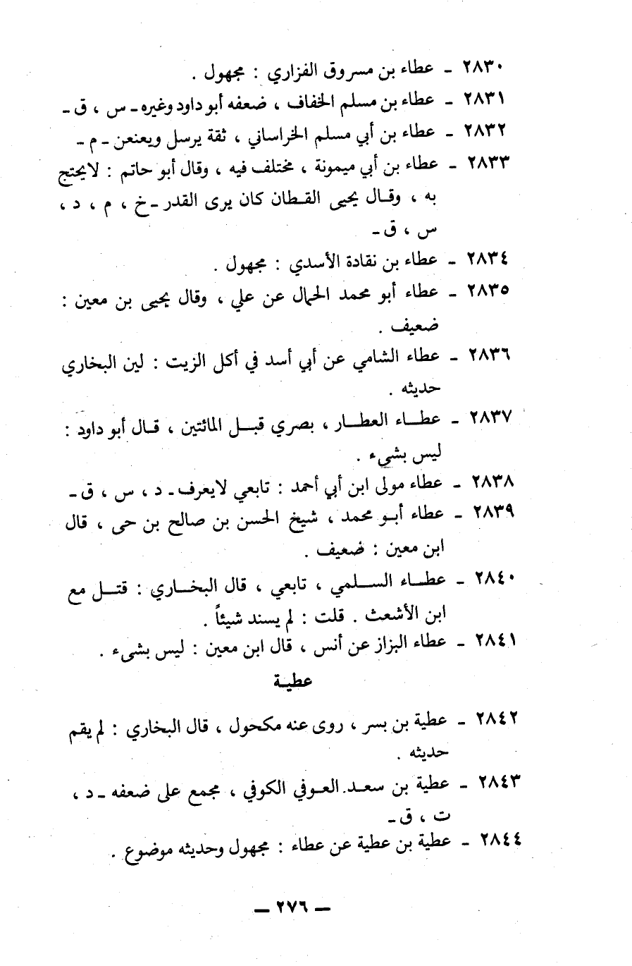2839 - عطاء، أبو محمد: شيخ الحسن بن صالح بن حي، قال ابن معين: ضعيف.