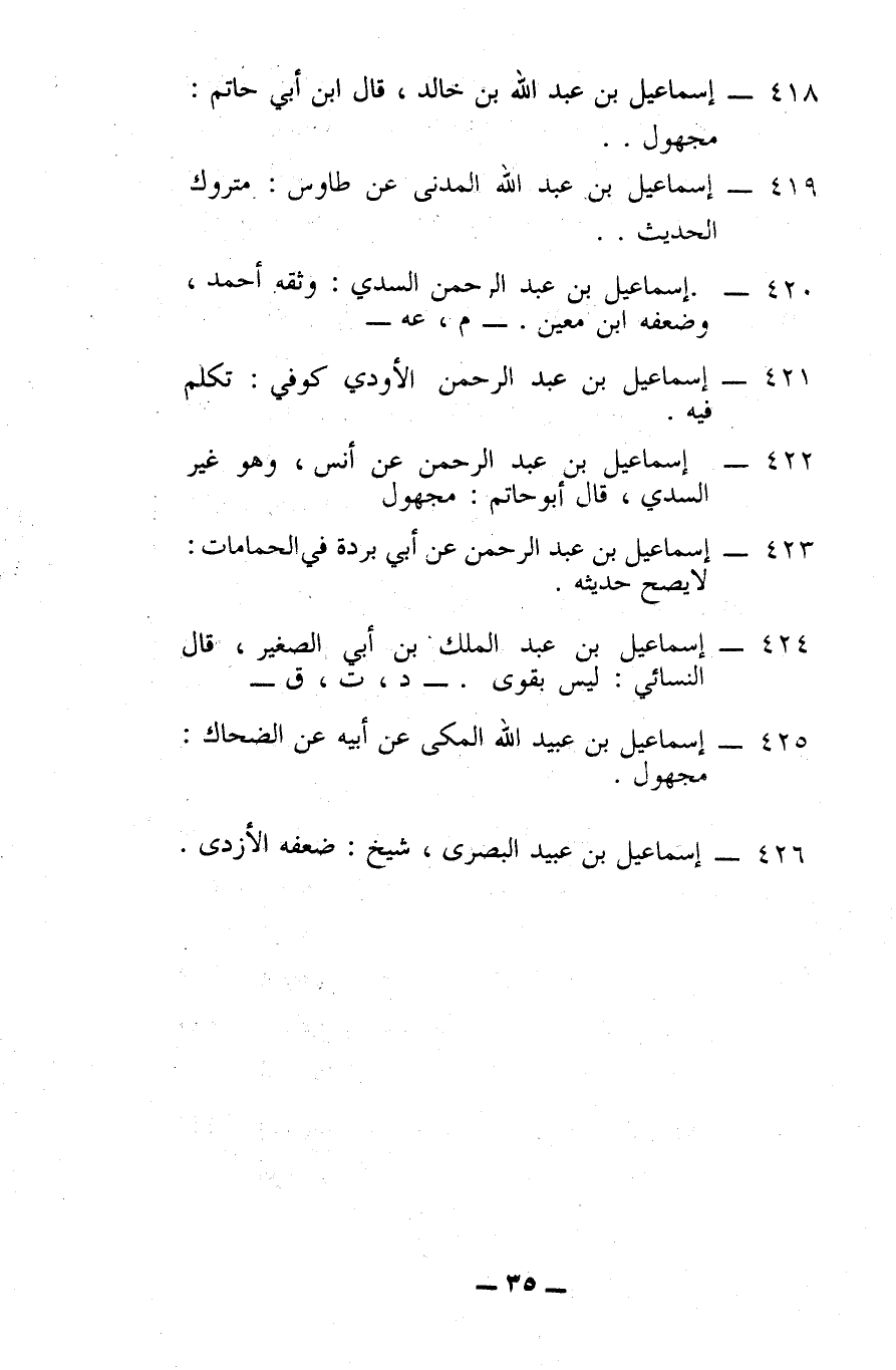 418 - إسماعيل بن عبد الله بن خالد: قال ابن أبي حاتم: مجهول.