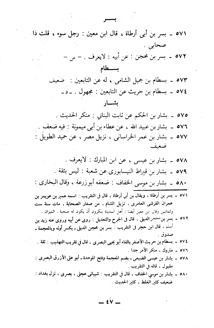 580 - بشار بن موسى الخفاف: ضعفه أبو زرعة، وقال البخاري: -[48]- منكر الحديث، وقال ابن عدي: أرجو أنه لا بأس به.