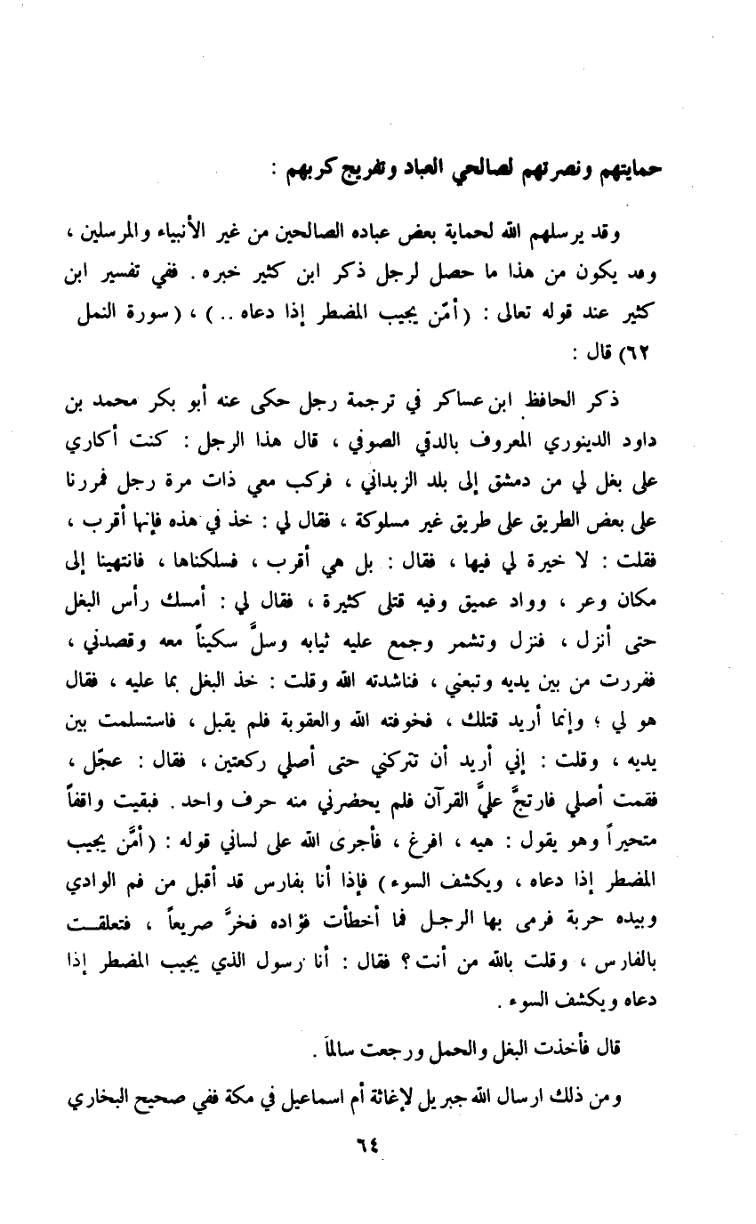 فاستسلمت بين يديه، وقلت: إني أريد أن تتركني حتى أصلي ركعتين، فقال: عجّل، فقمت أصلي، فأُرتِج عليَّ القرآن، فلم يحضرني منه حرف واحد، فبقيت واقفاً متحيراً، وهو يقول: هيه، افرغ، فأجرى الله على لساني قوله: (أمَّن يجيب المضطر إذا دعاهُ ويكشف السوء) [النمل: 62] ، فإذا أنا بفارس قد أقبل من فم الوادي وبيده حربة، فرمى بها الرجل، فما أخطأت فؤاده، فخرّ صريعاً، فتعلقت بالفارس، وقلت: بالله من أنت؟ فقال: أنا رسول الذي يجيب المضطر، إذا دعاه، ويكشف السوء. قال: فأخذت البغل والحمل، ورجعت سالما ".
