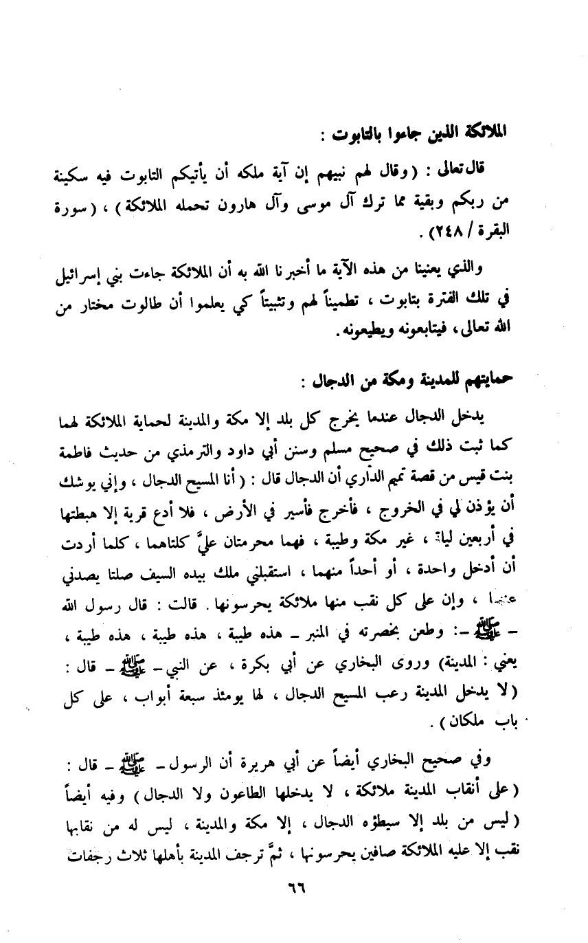 وفي صحيح البخاري أيضاً عن أبي هريرة: أن الرسول صلى الله عليه وسلم قال: (على أنقاب المدينة ملائكة، لا يدخلها الطاعون ولا الدجال) (¬3) .