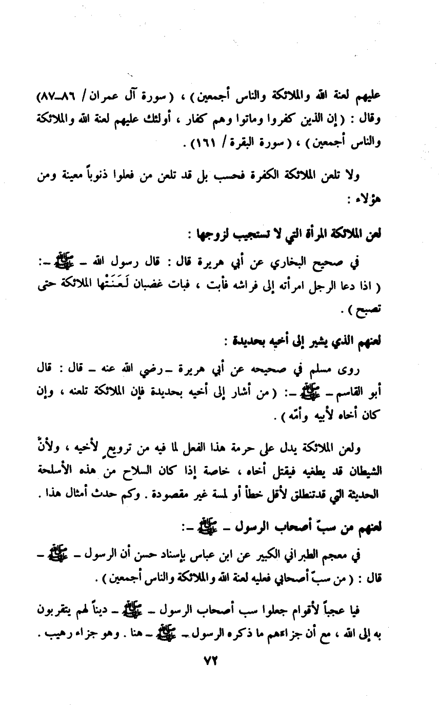 عليهم لعنة الله والملائكة والنَّاس أجمعين) [آل عمران: 86-87] ، وقال: (إنَّ الَّذين كفروا وماتوا وهم كفَّار أولئك عليهم لعنة الله والملائكة والنَّاس أجمعين) [البقرة: 161] .
