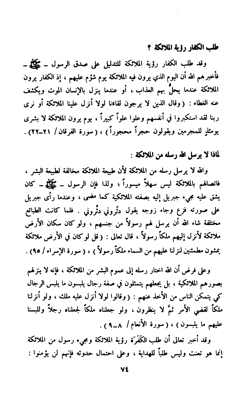 وقد طلب الكفار رؤية الملائكة للتدليل على صدق الرسول صلى الله عليه وسلم، فأخبرهم الله أن اليوم الذي يرون فيه الملائكة يوم شؤم عليهم؛ إذ الكفار يرون الملائكة عندما يحلّ بهم العذاب، أو عندما ينزل بالإنسان الموت، ويكشف عنه الغطاء: (وقال الَّذين لا يرجون لقاءنا لولا أنزل علينا الملائكة أو نرى ربَّنا لقد استكبروا في أنفسهم وعتو عتوّاً كبيراً - يوم يرون الملائكة لا بشرى يومئذٍ للمجرمين ويقولون حِجراً مَّحجُوراً) [الفرقان: 21-22] .
