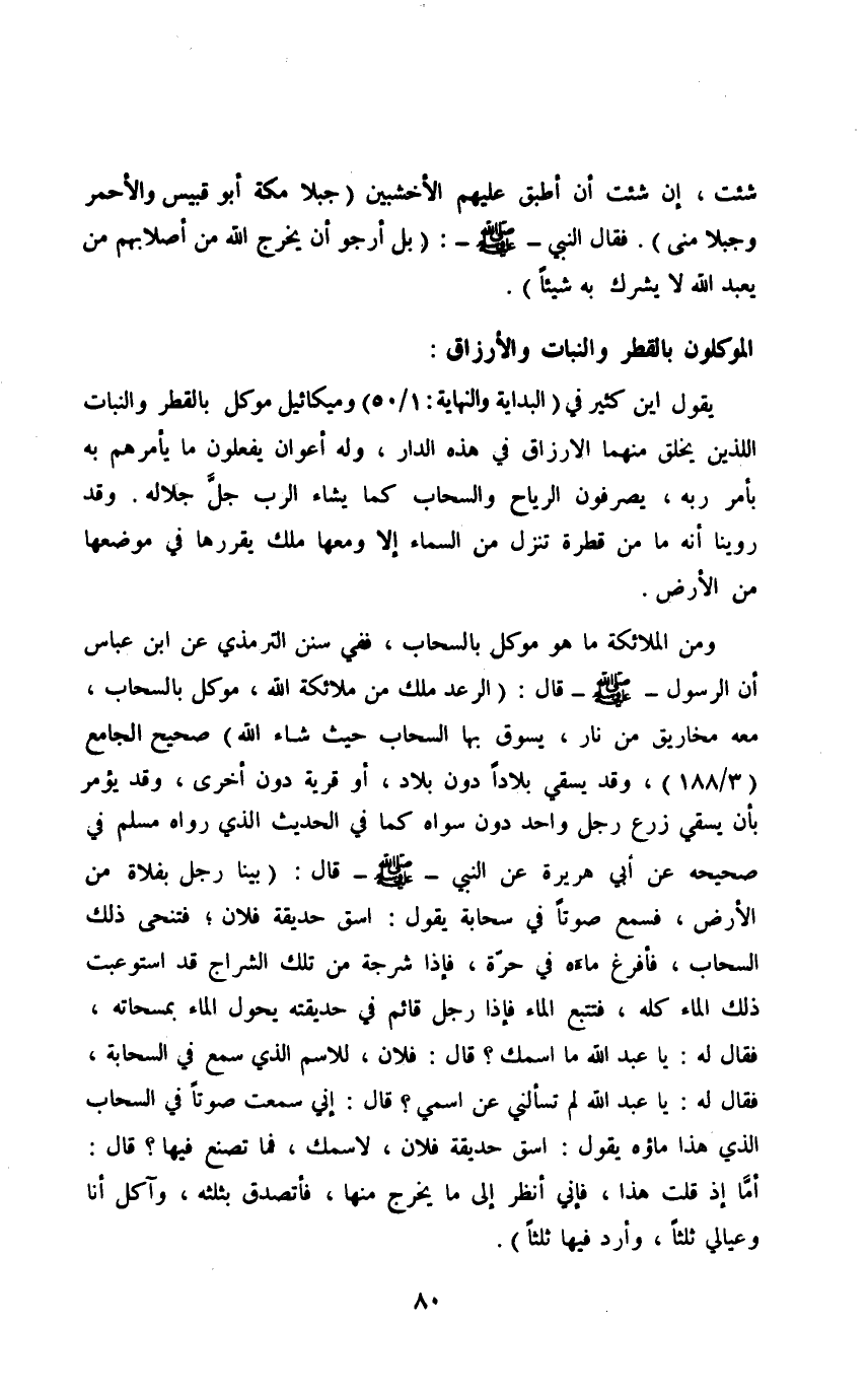 ومن الملائكة ما هو موكل بالسحاب، ففي سنن الترمذي عن ابن عباس: أن الرسول صلى الله عليه وسلم قال: (الرعد ملك من الملائكة موكل بالسحاب، معه مخاريق من نار، يسوق بها السحاب حيث شاء الله) (¬4) ، وقد يسقي بلاداً دون بلاد، أو قرية دون أخرى.