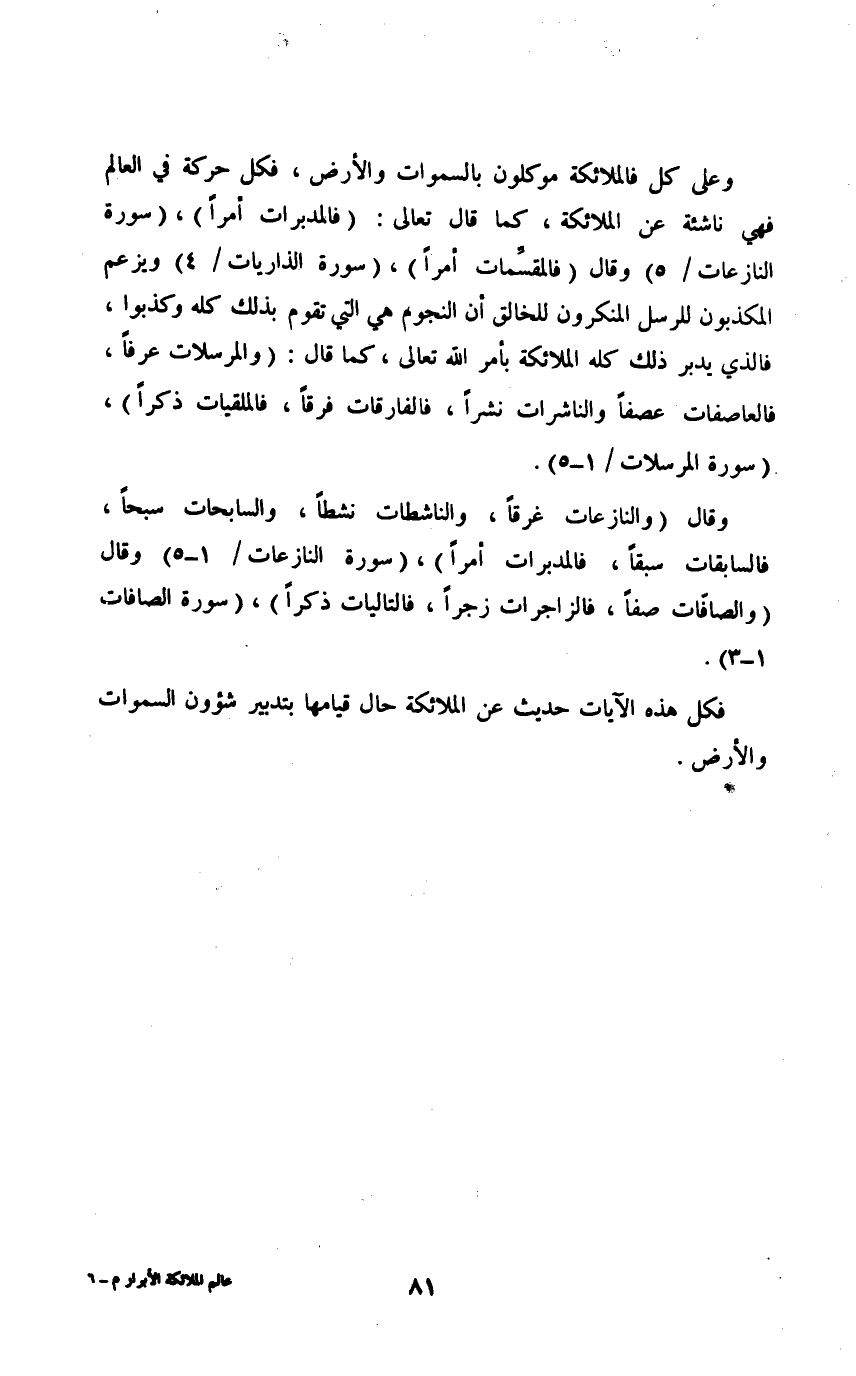 وقال: (والنَّازعات غرقاً - والناَّشطات نشطاً - والسَّابحات سبحاً - فالسَّابقات سبقاً - فالمدبِّرات أمراً) [النازعات: 1-5] ، وقال: (والصَّافَّات صفاً - فالزَّاجرات زجراً - فالتَّاليات ذكراً) [الصافّات: 1-3] .