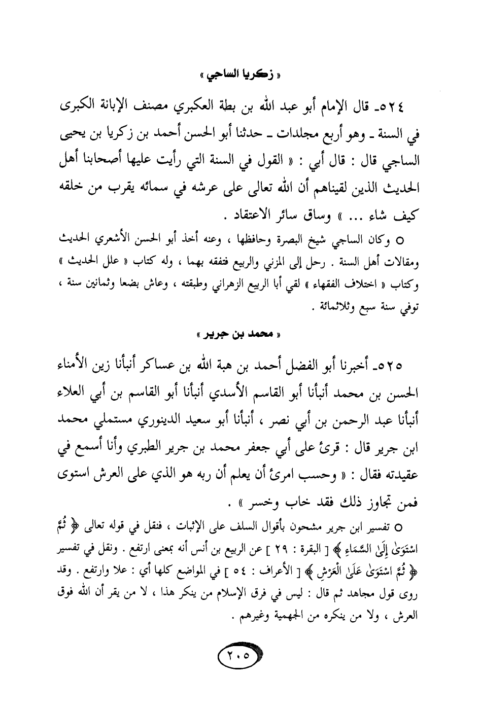 524 - قَالَ الإِمَام أَبُو عبد الله بن بطة العكبري مُصَنف الْإِبَانَة الْكُبْرَى فِي السّنة وَهُوَ أَربع مجلدات حَدثنَا أَبُو الْحسن أَحْمد بن زَكَرِيَّا بن يحيى السَّاجِي قَالَ قَالَ أبي القَوْل فِي السّنة الَّتِي رَأَيْت عَلَيْهَا أَصْحَابنَا أهل الحَدِيث الَّذين لَقِينَاهُمْ أَن الله تَعَالَى على عَرْشه فِي سمائه يقرب من خلقه كَيفَ شَاءَ وسَاق سَائِر الإعتقاد // وَكَانَ السَّاجِي شيخ الْبَصْرَة وحافظها وَعنهُ أَخذ أَبُو الْحسن الْأَشْعَرِيّ الحَدِيث ومقالات أهل السّنة