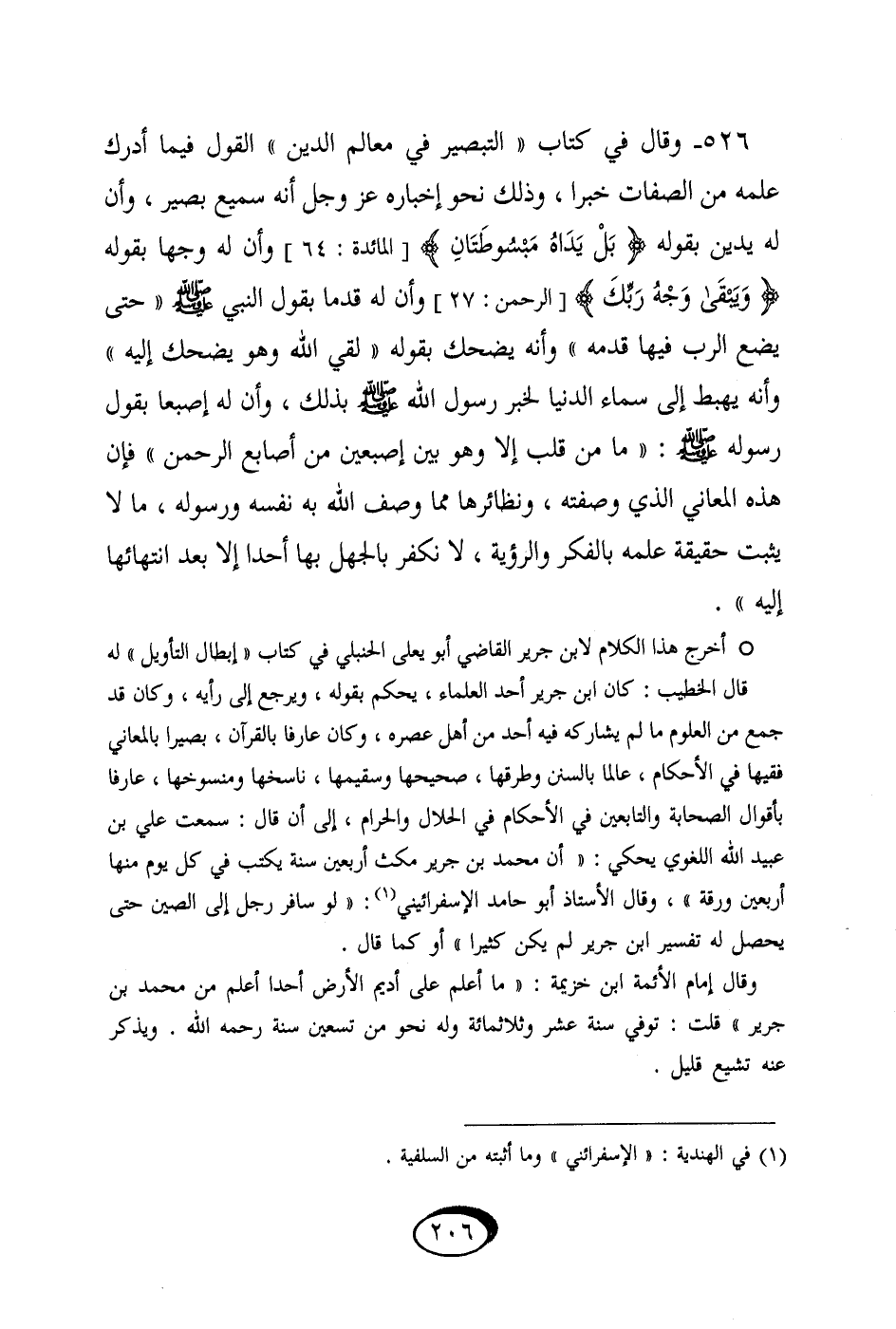 526 - وَقَالَ فِي كتاب التبصير فِي معالم الدّين القَوْل فِيمَا أدْرك علمه من الصِّفَات خَبرا وَذَلِكَ نَحْو إخْبَاره عزوجل أَنه سميع بَصِير وَأَن لَهُ يدين بقوله {بَلْ يَدَاهُ مَبْسُوطَتَانِ} وَأَن لَهُ وَجها بقوله {وَيَبْقَى وَجه رَبك} وَأَن لَهُ قدماً بقول النَّبِي صلى الله عَلَيْهِ وَسلم حَتَّى يضع الرب فِيهَا قدمه وَأَنه يضْحك بقوله لَقِي الله وَهُوَ يضْحك إِلَيْهِ وَأَنه يهْبط إِلَى سَمَاء الدُّنْيَا لخَبر رَسُول الله صلى الله عَلَيْهِ وَسلم بذلك وَأَن لَهُ إصبعا بقول رَسُوله صَلَّى اللَّهُ عَلَيْهِ وَسَلَّمَ مَا من قلب إِلَّا وَهُوَ بَين أصبعين من أَصَابِع الرَّحْمَن فَإِن هَذِه الْمعَانِي الَّذِي وَصفته ونظائرها مِمَّا وصف الله بِهِ نَفسه وَرَسُوله مَا لَا يثبت حَقِيقَة علمه بالفكر والرؤية لَا نكفر بِالْجَهْلِ بهَا أحدا إِلَّا بعد انتهائها إِلَيْهِ // أخرج هَذَا الْكَلَام لِابْنِ جرير القَاضِي أَبُو يعلى الْحَنْبَلِيّ فِي كتاب إبِْطَال التَّأْوِيل لَهُ قَالَ الْخَطِيب كَانَ ابْن جرير أحد الْعلمَاء يحكم بقوله وَيرجع إِلَى رَأْيه وَكَانَ قد جمع من الْعُلُوم مَا لم يُشَارِكهُ فِيهِ أحد من أهل عصره وَكَانَ عَارِفًا بِالْقُرْآنِ بَصيرًا بالمعاني فَقِيها فِي الْأَحْكَام عَالما بالسنن وطرقها صحيحها وسقيمها ناسخها ومنسوخها عَارِفًا بأقوال الصَّحَابَة وَالتَّابِعِينَ فِي الْأَحْكَام فِي الْحَلَال وَالْحرَام إِلَى أَن قَالَ سَمِعت عَليّ بن عبيد الله اللّغَوِيّ يَحْكِي أَن مُحَمَّد بن جرير مكث أَرْبَعِينَ سنة يكْتب فِي كل يَوْم مِنْهَا أَرْبَعِينَ ورقة وَقَالَ الإستاذ أَبُو حَامِد الإسفرائيني لَو سَافر رجل إِلَى الصين حَتَّى يحصل لَهُ تَفْسِير ابْن جرير لم يكن كثيرا أَو كَمَا قَالَ