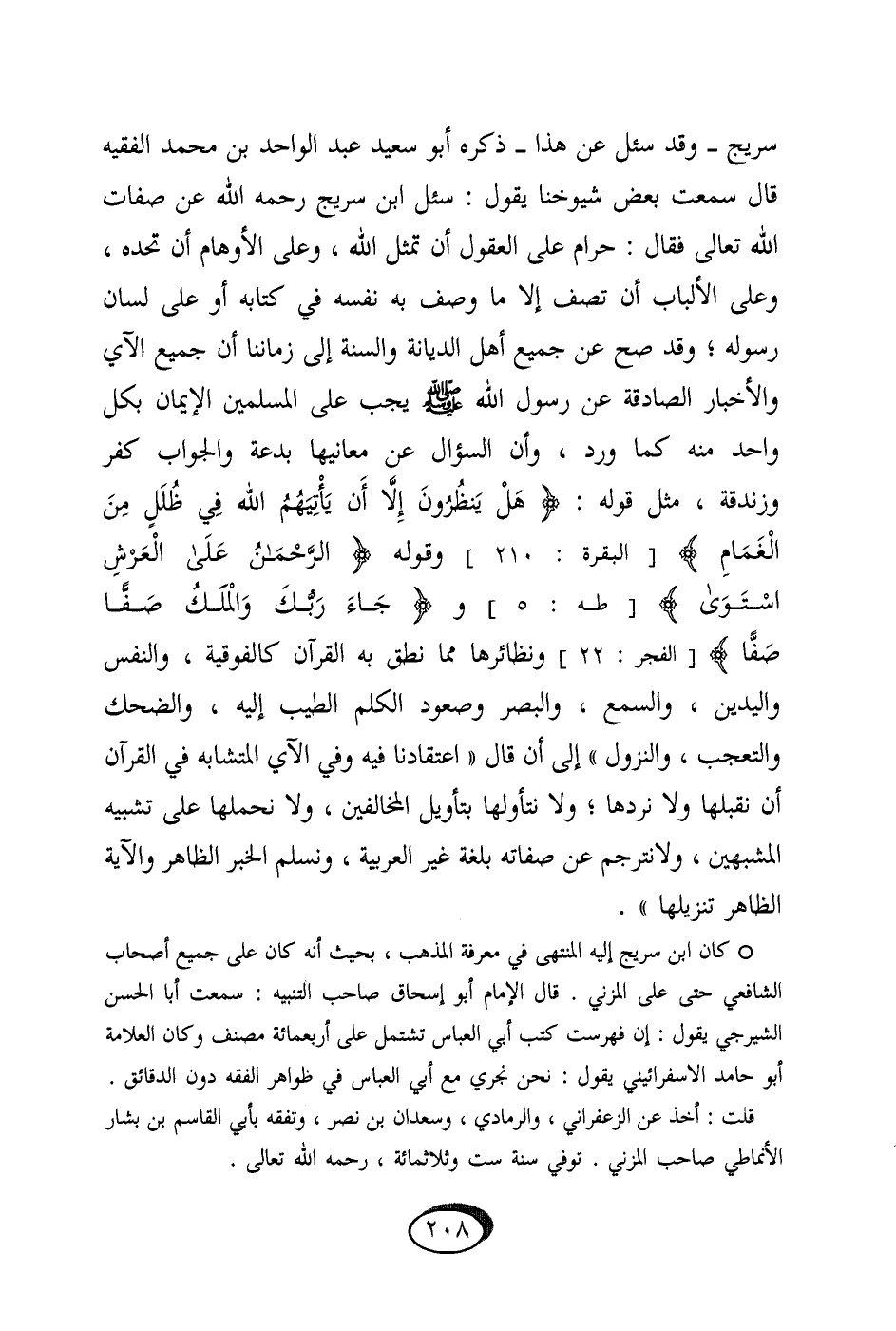 سُرَيج وَقد سُئِلَ عَن هَذَا ذكره أَبُو سعيد عبد الْوَاحِد بن مُحَمَّد الْفَقِيه قَالَ سَمِعت بعض شُيُوخنَا يَقُول سُئِلَ ابْن سُرَيج رَحمَه الله عَن صِفَات الله تَعَالَى فَقَالَ حرَام على الْعُقُول أَن تمثل الله وعَلى الأوهام أَن تحده وعَلى الْأَلْبَاب أَن تصف إِلَّا مَا وصف بِهِ نَفسه فِي كِتَابه أَو على لِسَان رَسُوله وَقد صَحَّ عَن جَمِيع أهل الدّيانَة وَالسّنة إِلَى زَمَاننَا أَن جَمِيع الْآي وَالْأَخْبَار الصادقة عَن رَسُول الله صلى الله عَلَيْهِ وَسلم يجب على الْمُسلمين الْإِيمَان بِكُل وَاحِد مِنْهُ كَمَا ورد وَأَن السُّؤَال عَن مَعَانِيهَا بِدعَة وَالْجَوَاب كفر وزندقة مثل قَوْله {هَلْ يَنْظُرُونَ إِلا أَنْ يَأْتِيَهُمُ اللَّهُ فِي ظُلَلٍ مِنَ الْغَمَامِ} وَقَوله {الرَّحْمَنُ عَلَى الْعَرْشِ اسْتَوَى} و {وَجَاءَ رَبُّكَ وَالْمَلَكُ صَفًّا صَفًّا} ونظائرها مِمَّا نطق بِهِ الْقُرْآن كالفوقية وَالنَّفس وَالْيَدَيْنِ والسمع وَالْبَصَر وصعود الْكَلم الطّيب إِلَيْهِ والضحك والتعجب وَالنُّزُول إِلَى أَن قَالَ اعتقادنا فِيهِ وَفِي الْآي الْمُتَشَابه فِي الْقُرْآن أَن نقبلها وَلَا نردها وَلَا نتأولها بِتَأْوِيل الْمُخَالفين وَلَا نحملها على تَشْبِيه المشبهين وَلَا نترجم عَن صِفَاته بلغَة غير الْعَرَبيَّة ونسلم الْخَبَر الظَّاهِر وَالْآيَة الظَّاهِر تنزيلها // كَانَ ابْن سُرَيج إِلَيْهِ الْمُنْتَهى فِي معرفَة الْمَذْهَب بِحَيْثُ أَنه كَانَ على جَمِيع أَصْحَاب الشَّافِعِي حَتَّى على الْمُزنِيّ