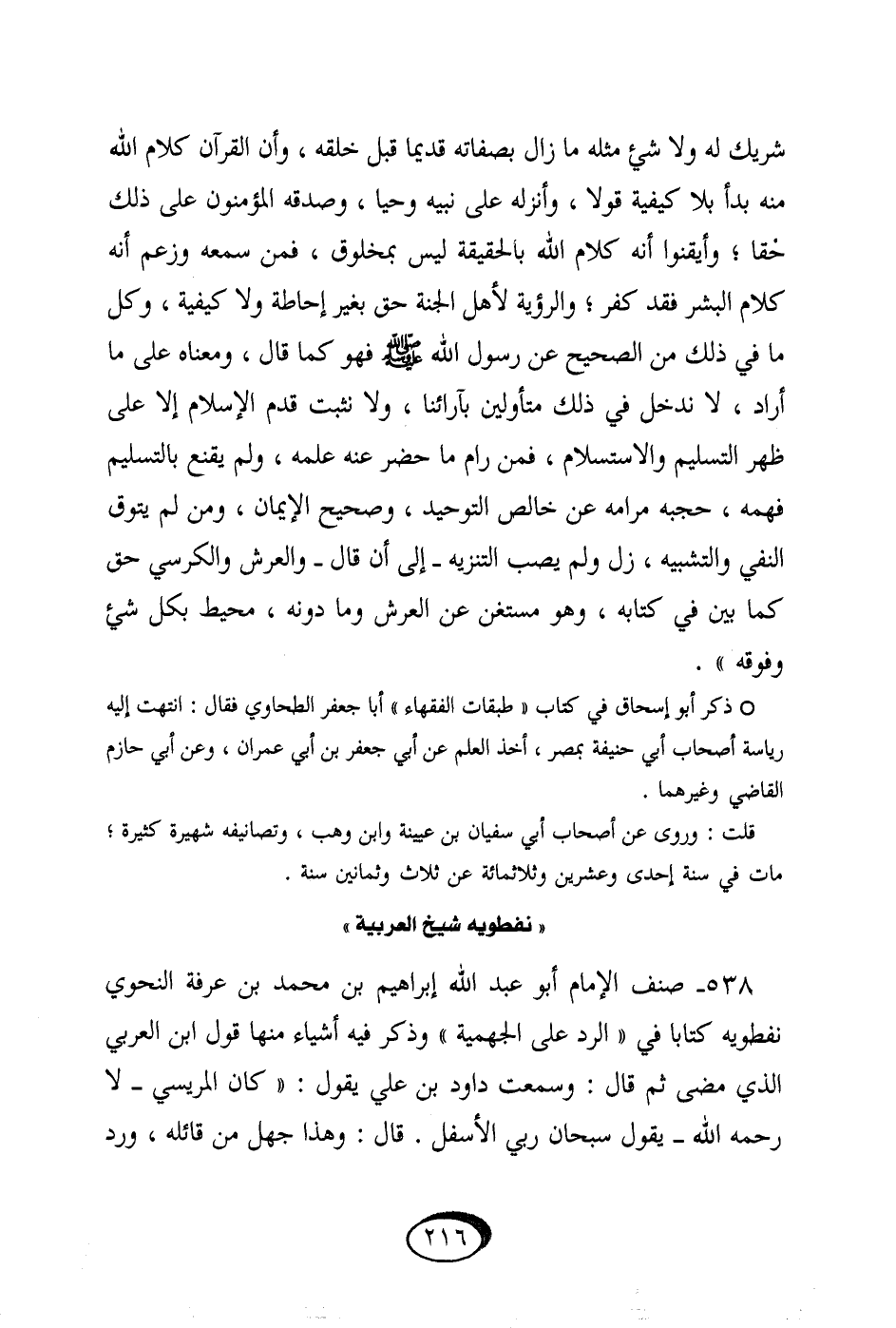 شريك لَهُ وَلَا شَيْء مثله مَا زَالَ بصفاته قَدِيما قبل خلقه وَأَن الْقُرْآن كَلَام الله مِنْهُ بدا بِلَا كَيْفيَّة قولا وأنزله على نبيه وَحيا وَصدقه الْمُؤْمِنُونَ على ذَلِك حَقًا وأيقنوا أَنه كَلَام الله بِالْحَقِيقَةِ لَيْسَ بمخلوق فَمن سَمعه وَزعم أَنه كَلَام الْبشر فقد كفر والرؤية لأهل الْجنَّة حق بِغَيْر إحاطة وَلَا كَيْفيَّة وكل مَا فِي ذَلِك من الصَّحِيح عَن رَسُول الله صلى الله عَلَيْهِ وَسلم فَهُوَ كَمَا قَالَ وَمَعْنَاهُ على مَا أَرَادَ لَا ندخل فِي ذَلِك متأولين بآرائنا وَلَا نثبت قدم الْإِسْلَام إِلَّا على ظهر التَّسْلِيم والاستسلام فَمن رام مَا حضر عَنهُ علمه وَلم يقنع بِالتَّسْلِيمِ فهمه حجبه مرامه عَن خَالص التَّوْحِيد وصحيح الْإِيمَان وَمن لم يتوق النَّفْي والتشبيه زل وَلم يصب التَّنْزِيه إِلَى أَن قَالَ وَالْعرش والكرسي حق كَمَا بَين فِي كِتَابه وَهُوَ مستغن عَن الْعَرْش وَمَا دونه مُحِيط بِكُل شَيْء وفوقه // ذكر أَبُو إِسْحَاق فِي كتاب طَبَقَات الْفُقَهَاء أَبَا جَعْفَر الطَّحَاوِيّ فَقَالَ إنتهت إِلَيْهِ رياسة أَصْحَاب أبي حنيفَة بِمصْر أَخذ الْعلم عَن أبي جَعْفَر بن أبي عمرَان وَعَن أبي حَازِم القَاضِي وَغَيرهمَا