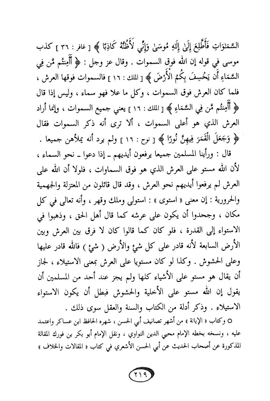وَذكر أَدِلَّة من الْكتاب وَالسّنة وَالْعقل سوى ذَلِك // وَكتاب الْإِبَانَة من أشهر تصانيف أبي الْحسن شهره الْحَافِظ ابْن عَسَاكِر وَاعْتمد عَلَيْهِ ونسخه بِخَطِّهِ الإِمَام محيي الدّين النواوي وَنقل الإِمَام أَبُو بكر بن فورك الْمقَالة الْمَذْكُورَة عَن أَصْحَاب الحَدِيث عَن أبي الْحسن الْأَشْعَرِيّ فِي كتاب المقالات وَالْخلاف