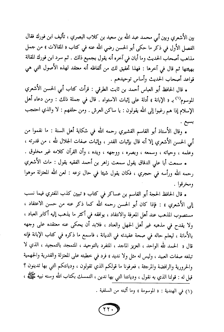 قَالَ الْحَافِظ الْحجَّة أَبُو الْقَاسِم بن عَسَاكِر فِي كتاب تَبْيِين كذب المفتري فِيمَا نسب إِلَى الْأَشْعَرِيّ فَإِذا كَانَ أَبُو الْحسن رَحمَه الله كَمَا ذكر عَنهُ من حسن الِاعْتِقَاد مستصوب الْمَذْهَب عِنْد أهل الْمعرفَة والانتقاد يُوَافقهُ فِي أَكثر مَا يذهب إِلَيْهِ أكَابِر الْعباد وَلَا يقْدَح فِي مذْهبه غير أهل الْجَهْل والعناد فَلَا بُد أَن يحْكى عَنهُ معتقده على وَجهه بالأمانة ليعلم حَاله فِي صِحَة عقيدته فِي الدّيانَة فاسمع مَا ذكره فِي كتاب الْإِبَانَة فَإِنَّهُ قَالَ الْحَمد لله الْوَاحِد الْعَزِيز الْمَاجِد المتفرد بِالتَّوْحِيدِ المتمجد بالتمجيد الَّذِي لَا تبلغه صِفَات العبيد وَلَيْسَ لَهُ مثل وَلَا نديد فَرد فِي خطبَته على الْمُعْتَزلَة والقدرية والجهمية والحرورية والرافضة والمرجئة فعرفونا مَا قَوْلكُم الَّذِي تَقولُونَ وديانتكم الَّتِي بهَا تدينون قيل لَهُ قَوْلنَا الَّذِي بِهِ نقُول وديانتنا الَّتِي بهَا ندين التَّمَسُّك بِكِتَاب الله وَسنة نبيه صلى الله عَلَيْهِ وَسلم