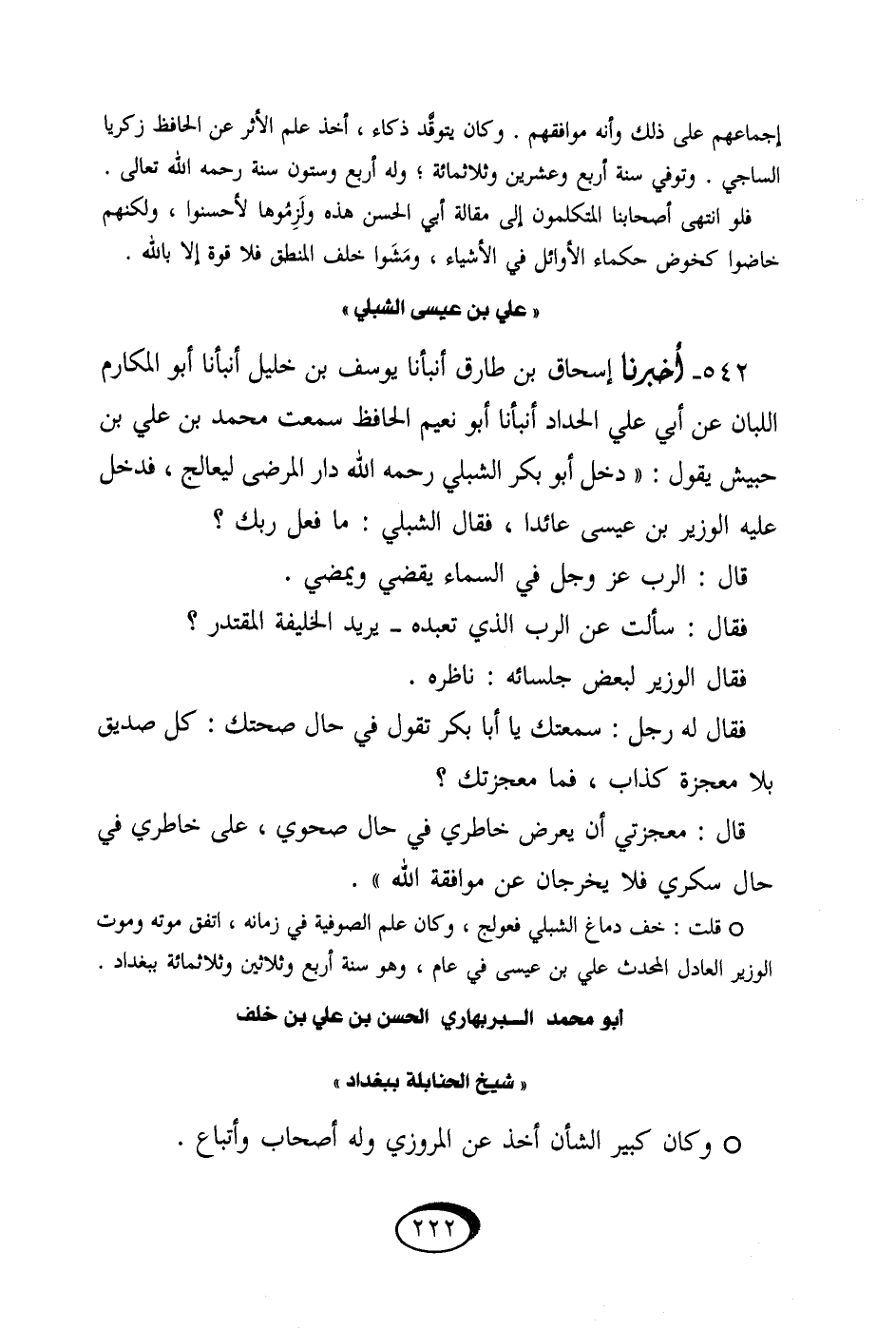 542 - أخبرنَا إِسْحَاق بن طَارق أَنبأَنَا يُوسُف بن خَلِيل أَنبأَنَا أَبُو المكارم اللبان عَن أبي عَليّ الْحداد أَنبأَنَا أَبُو نعيم الْحَافِظ سَمِعت مُحَمَّد بن عَليّ بن حُبَيْش يَقُول دخل أَبُو بكر الشبلي رَحمَه الله دَار المرضى ليعالج فَدخل عَلَيْهِ الْوَزير بن عِيسَى عَائِدًا فَقَالَ الشبلي مَا فعل رَبك