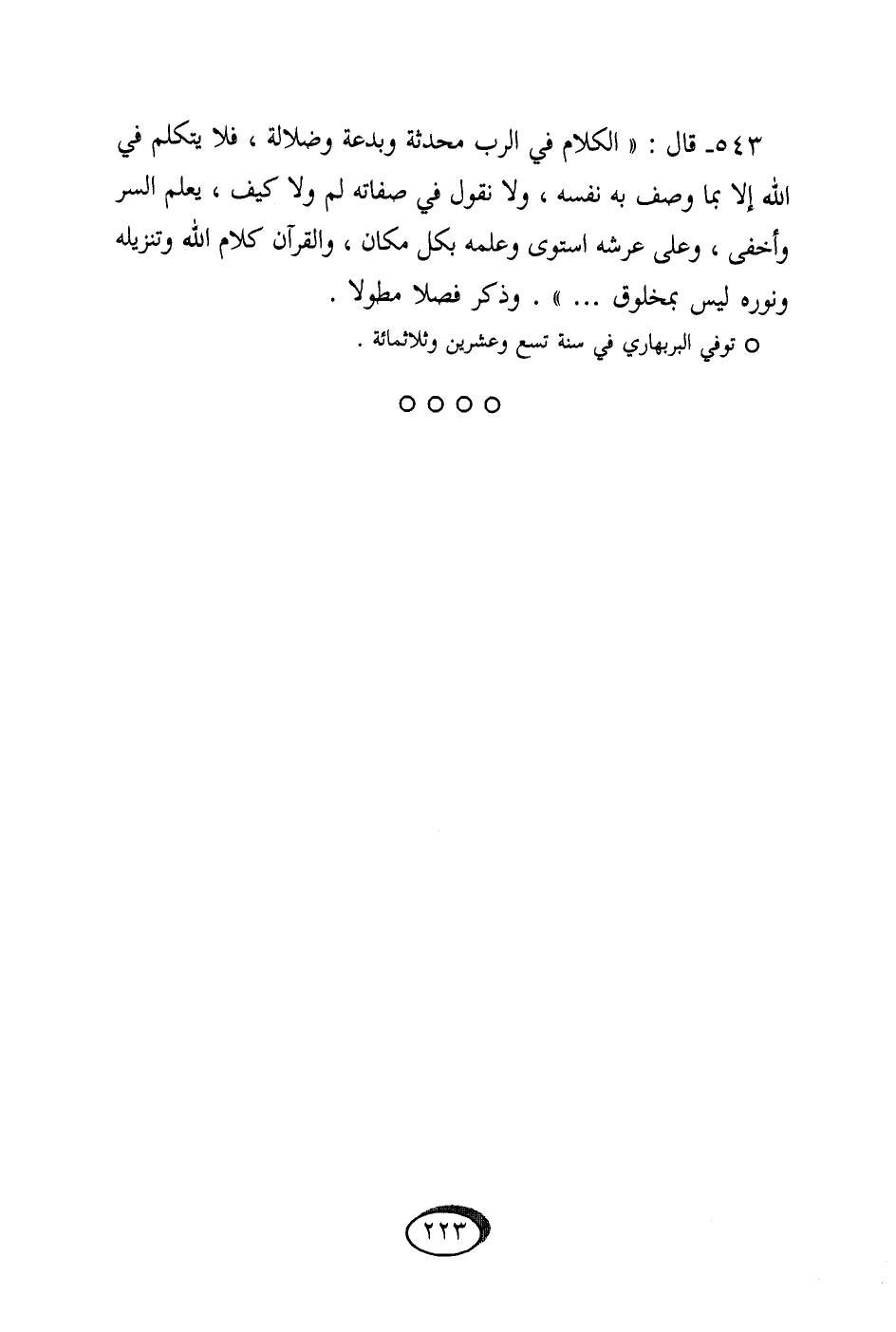 543 - قَالَ الْكَلَام فِي الرب محدثة وبدعة وضلالة فَلَا يتَكَلَّم فِي الله إِلَّا بِمَا وصف بِهِ نَفسه وَلَا نقُول فِي صِفَاته لم وَلَا كَيفَ يعلم السِّرّ وأخفى وعَلى عَرْشه اسْتَوَى وَعلمه بِكُل مَكَان وَالْقُرْآن كَلَام الله وتنزيله ونوره لَيْسَ بمخلوق وَذكر فصلا مطولا