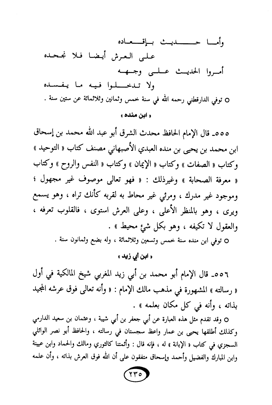 555 - قَالَ الإِمَام الْحَافِظ مُحدث الشرق أَبُو عبد الله مُحَمَّد بن إِسْحَاق ابْن مُحَمَّد بن يحيى بن مَنْدَه الْعَبْدي الْأَصْبَهَانِيّ مُصَنف كتاب التَّوْحِيد وَكتاب الصِّفَات وَكتاب الْإِيمَان وَكتاب النَّفس وَالروح وَكتاب معرفَة الصَّحَابَة وَغير ذَلِك فَهُوَ تَعَالَى مَوْصُوف غير مَجْهُول وموجود غير مدرك ومرئي غير محاط بِهِ لقُرْبه كَأَنَّك ترَاهُ وَهُوَ يسمع وَيرى وَهُوَ بالمنظر الْأَعْلَى وعَلى الْعَرْش اسْتَوَى فالقلوب تعرفه والعقول لَا تكيفه وَهُوَ بِكُل شَيْء مُحِيط // توفّي ابْن مَنْدَه سنة خمس وَتِسْعين وثلاثمائة وَله بضع وَثَمَانُونَ سنة //