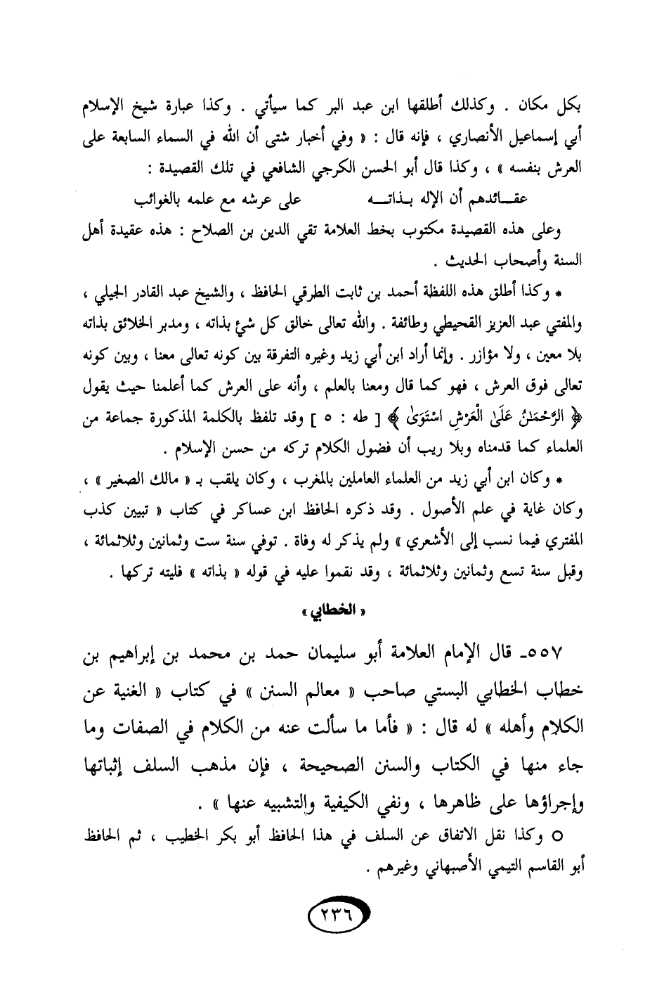 557 - قَالَ الإِمَام الْعَلامَة أَبُو سُلَيْمَان حمد بن مُحَمَّد بن إِبْرَاهِيم بن خطاب الْخطابِيّ البستي صَاحب معالم السّنَن فِي كتاب الغنية عَن الْكَلَام وَأَهله لَهُ قَالَ فَأَما مَا سَأَلت عَنهُ من الْكَلَام فِي الصِّفَات وَمَا جَاءَ مِنْهَا فِي الْكتاب وَالسّنَن الصَّحِيحَة فَإِن مَذْهَب السّلف إِثْبَاتهَا وإجراؤها على ظَاهرهَا وَنفي الْكَيْفِيَّة والتشبيه عَنْهَا // وَكَذَا نقل الِاتِّفَاق عَن السّلف فِي هَذَا الْحَافِظ أَبُو بكر الْخَطِيب ثمَّ الْحَافِظ أَبُو الْقَاسِم التَّيْمِيّ الْأَصْبَهَانِيّ وَغَيرهم