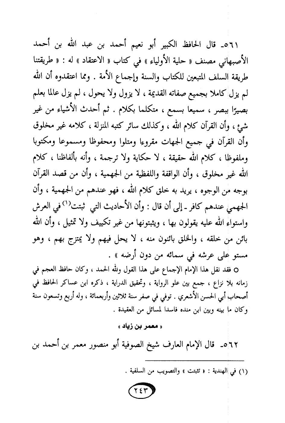 561 - قَالَ الْحَافِظ الْكَبِير أَبُو نعيم أَحْمد بن عبد الله بن أَحْمد الْأَصْبَهَانِيّ مُصَنف حلية الْأَوْلِيَاء فِي كتاب الإعتقاد لَهُ طريقتنا طَريقَة السّلف المتبعين للْكتاب وَالسّنة وَإِجْمَاع الْأمة