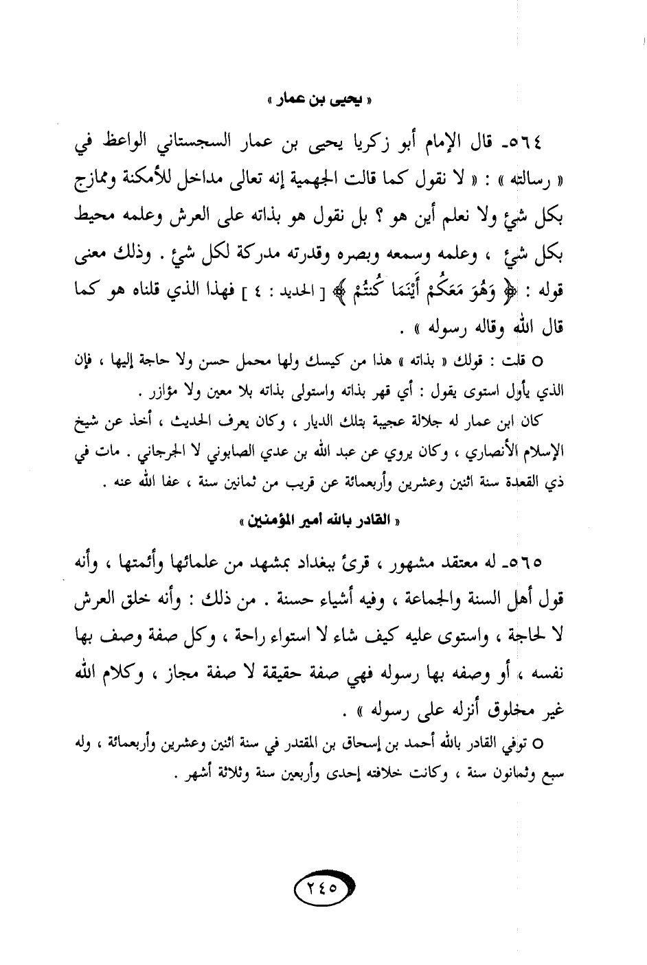 من ذَلِك وَأَنه خلق الْعَرْش لَا لحَاجَة واستوى عَلَيْهِ كَيفَ شَاءَ لَا اسْتِوَاء رَاحَة وكل صفة وصف بهَا نَفسه أَو وَصفه بهَا رَسُوله فَهِيَ صفة حَقِيقَة لَا صفة مجَاز وَكَلَام الله غير مَخْلُوق أنزلهُ على رَسُوله // توفّي الْقَادِر بِاللَّه أَحْمد بن إِسْحَاق بن المقتدر فِي سنة إثنين وَعشْرين وَأَرْبَعمِائَة وَله سبع وَثَمَانُونَ سنة وَكَانَت خِلَافَته إِحْدَى وَأَرْبَعين سنة وَثَلَاثَة أشهر //