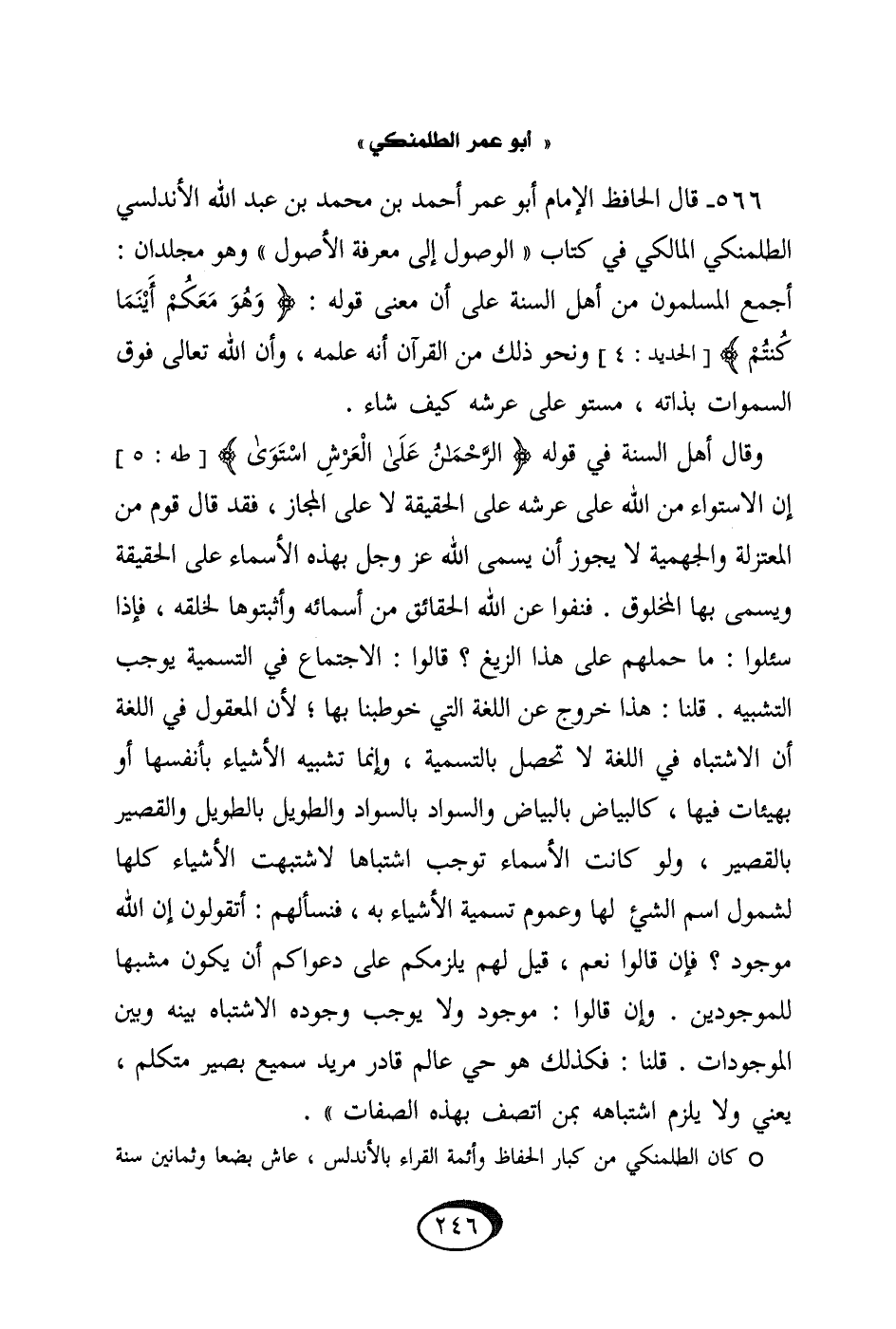 566 - قَالَ الْحَافِظ الإِمَام أَبُو عمر أَحْمد بن مُحَمَّد بن عبد الله الأندلسي الطلمنكي الْمَالِكِي فِي كتاب الْوُصُول إِلَى معرفَة الْأُصُول وَهُوَ مجلدان أجمع الْمُسلمُونَ من أهل السّنة على أَن معنى قَوْله {وَهُوَ مَعكُمْ أَيْن مَا كُنْتُم} وَنَحْو ذَلِك من الْقُرْآن أَنه علمه وَأَن الله تَعَالَى فَوق السَّمَوَات بِذَاتِهِ مستو على عَرْشه كَيفَ شَاءَ