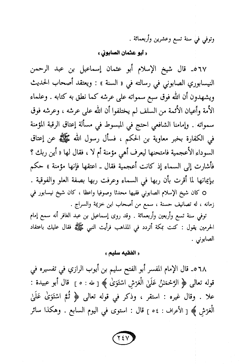 وإمامنا الشَّافِعِي احْتج فِي الْمَبْسُوط فِي مَسْأَلَة إِعْتَاق الرَّقَبَة المؤمنة فِي الْكَفَّارَة بِخَبَر مُعَاوِيَة بن الحكم فَسَأَلَ رَسُول الله صلى الله عَلَيْهِ وَسلم عَن إِعْتَاق السَّوْدَاء الأعجمية فامتحنها ليعرف أَهِي مُؤمنَة أم لَا فَقَالَ لَهَا أَيْن رَبك فَأَشَارَتْ إِلَى السَّمَاء إِذْ كَانَت أَعْجَمِيَّة فَقَالَ أعْتقهَا فَإِنَّهَا مُؤمنَة حكم بإيمانها لما أقرَّت بِأَن رَبهَا فِي السَّمَاء وَعرفت رَبهَا بِصفة الْعُلُوّ والفوقية // كَانَ شيخ الْإِسْلَام الصَّابُونِي فَقِيها مُحدثا وصوفياً واعظاً كَانَ شيخ نيسابور فِي زَمَانه لَهُ تصانيف حَسَنَة سمع من أَصْحَاب ابْن خُزَيْمَة والسراج