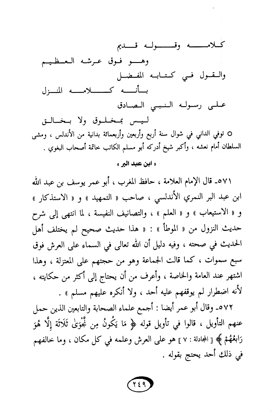 571 - قَالَ الإِمَام الْعَلامَة حَافظ الْمغرب أَبُو عمر يُوسُف بن عبد الله ابْن عبد الْبر النمري الأندلسي صَاحب التَّمْهِيد والاستذكار والاستيعاب وَالْعلم والتصانيف النفيسة لما انْتهى إِلَى شرح حَدِيث النُّزُول من الْمُوَطَّأ هَذَا حَدِيث صَحِيح لم يخْتَلف أهل الحَدِيث فِي صِحَّته وَفِيه دَلِيل أَن الله تَعَالَى فِي السَّمَاء على الْعَرْش فَوق سبع سموات كَمَا قَالَت الْجَمَاعَة وَهُوَ من حجتهم على الْمُعْتَزلَة وَهَذَا اشْتهر عِنْد الْعَامَّة والخاصة وَأعرف من أَن يحْتَاج إِلَى أَكثر من حكايته لِأَنَّهُ اضطرار لم يوقفهم عَلَيْهِ أحد وَلَا أنكرهُ عَلَيْهِم مُسلم