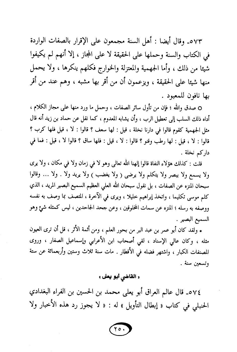574 - قَالَ عَالم الْعرَاق أَبُو يعلى مُحَمَّد بن الْحُسَيْن بن الْفراء الْبَغْدَادِيّ الْحَنْبَلِيّ فِي كتاب إبِْطَال التَّأْوِيل لَهُ لَا يجوز رد هَذِه الْأَخْبَار وَلَا