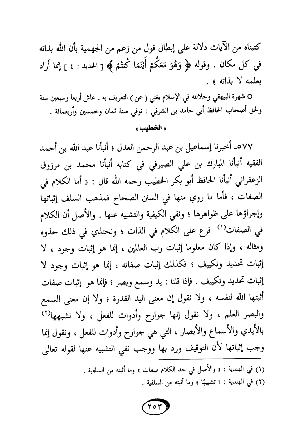577 - أَخْبَرَنَا إِسْمَاعِيلُ بْنُ عَبْدِ الرَّحْمَنِ الْعدْل أَنبأَنَا عَبْدُ اللَّهِ بْنُ أَحْمَدَ الْفَقِيهُ أَنبأَنَا الْمُبَارك بن عَليّ الصَّيْرَفِي فِي كِتَابه أَنبأَنَا مُحَمَّد بن مَرْزُوق الزَّعْفَرَانِي أَنبأَنَا الْحَافِظ أَبُو بكر الْخَطِيب رَحمَه الله قَالَ أما الْكَلَام فِي الصِّفَات فَأَما مَا رُوِيَ مِنْهَا فِي السّنَن الصِّحَاح فمذهب السّلف إِثْبَاتهَا وإجراؤها على ظواهرها وَنفي الْكَيْفِيَّة والتشبيه عَنْهَا