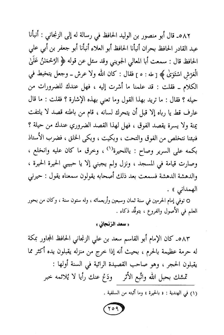 582 - قَالَ أَبُو مَنْصُور بن الْوَلِيد الْحَافِظ فِي رِسَالَة لَهُ إِلَى الزنجاني انبأنا عبد الْقَادِر الْحَافِظ بحران أَنبأَنَا الْحَافِظ أَبُو الْعَلَاء أَنبأَنَا أَبُو جَعْفَر بن أبي عَليّ الْحَافِظ قَالَ سَمِعت أَبَا الْمَعَالِي الْجُوَيْنِيّ وَقد سُئِلَ عَن قَوْله {الرَّحْمَن على الْعَرْش اسْتَوَى} فَقَالَ كَانَ الله وَلَا عرش وَجعل يتخبط فِي الْكَلَام فَقلت قد علمنَا مَا أَشرت إِلَيْهِ فَهَل عنْدك للضرورات من حِيلَة فَقَالَ مَا تُرِيدُ بِهَذَا القَوْل وَمَا تَعْنِي بِهَذِهِ الْإِشَارَة فَقلت مَا قَالَ عَارِف قطّ يَا رباه إِلَّا قبل أَن يَتَحَرَّك لِسَانه قَامَ من بَاطِنه قصد لَا يلْتَفت يمنة وَلَا يسرة يقْصد الفوق فَهَل لهَذَا الْقَصْد الضَّرُورِيّ عنْدك من حِيلَة فنبئنا نتخلص من الفوق والتحت وبكيت وَبكى الْخلق فَضرب الْأُسْتَاذ بكمه على السرير وَصَاح ياللحيرة وخرق مَا كَانَ عَلَيْهِ وانخلع وَصَارَت قِيَامَة فِي الْمَسْجِد وَنزل وَلم يجبني إِلَّا يَا حَبِيبِي الْحيرَة الْحيرَة والدهشة الدهشة فَسمِعت بعد ذَلِك أَصْحَابه يَقُولُونَ سمعناه يَقُول حيرني الْهَمدَانِي // توفّي إِمَام الْحَرَمَيْنِ فِي سنة ثَمَان وَسبعين وَأَرْبَعمِائَة وَله سِتُّونَ سنة وَكَانَ من بحور الْعلم فِي الْأُصُول وَالْفُرُوع يتوقد ذكاء //