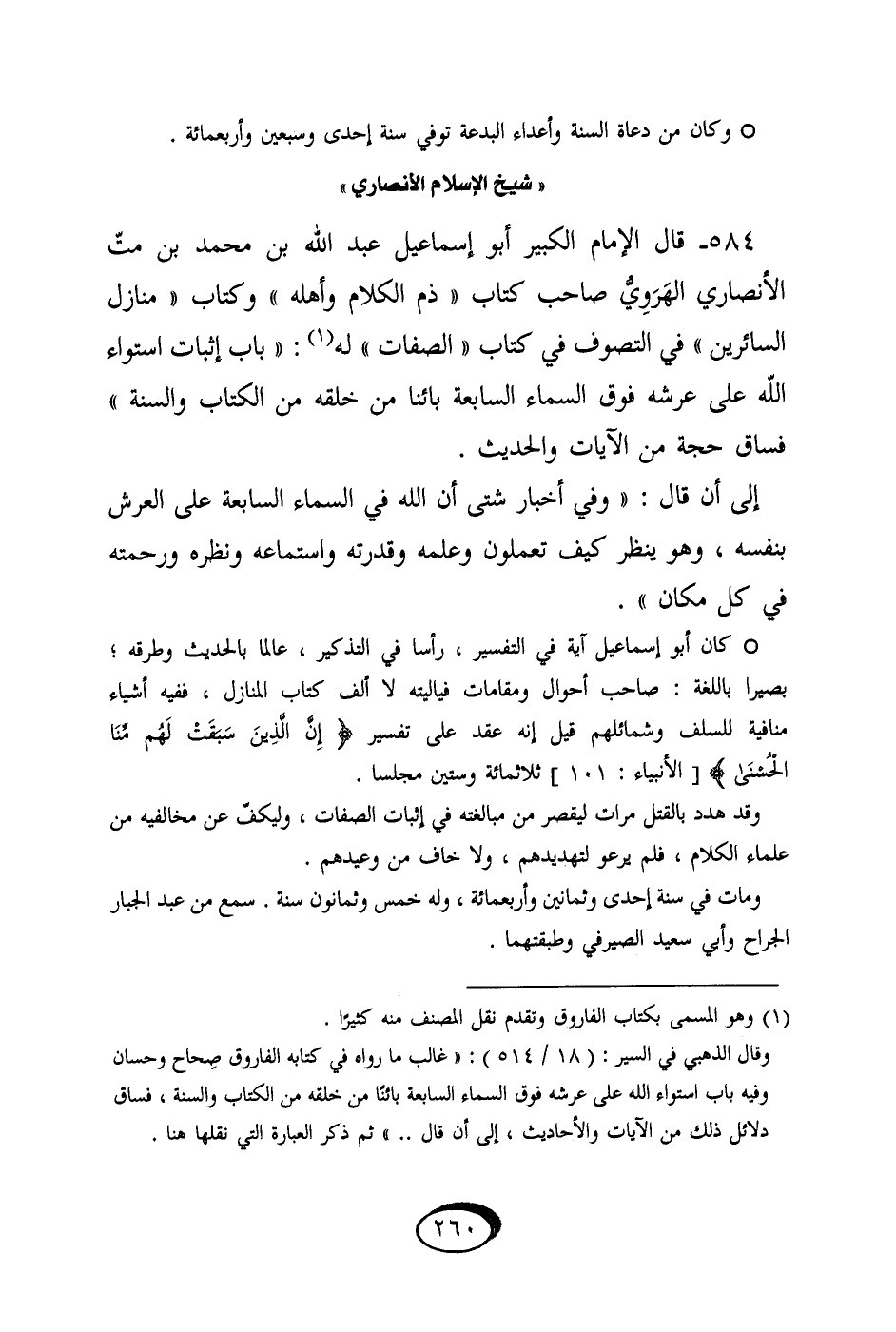 584 - قَالَ الإِمَام الْكَبِير أَبُو إِسْمَاعِيل عبد الله بن مُحَمَّد بن مت الْأنْصَارِيّ الْهَرَوِيّ صَاحب كتاب ذمّ الْكَلَام وَأَهله وَكتاب منَازِل السائرين فِي التصوف فِي كتاب الصِّفَات لَهُ بَاب إِثْبَات إستواء الله على عَرْشه فَوق السَّمَاء السَّابِعَة بَائِنا من خلقه من الْكتاب وَالسّنة فساق حجَّة من الْآيَات والْحَدِيث
