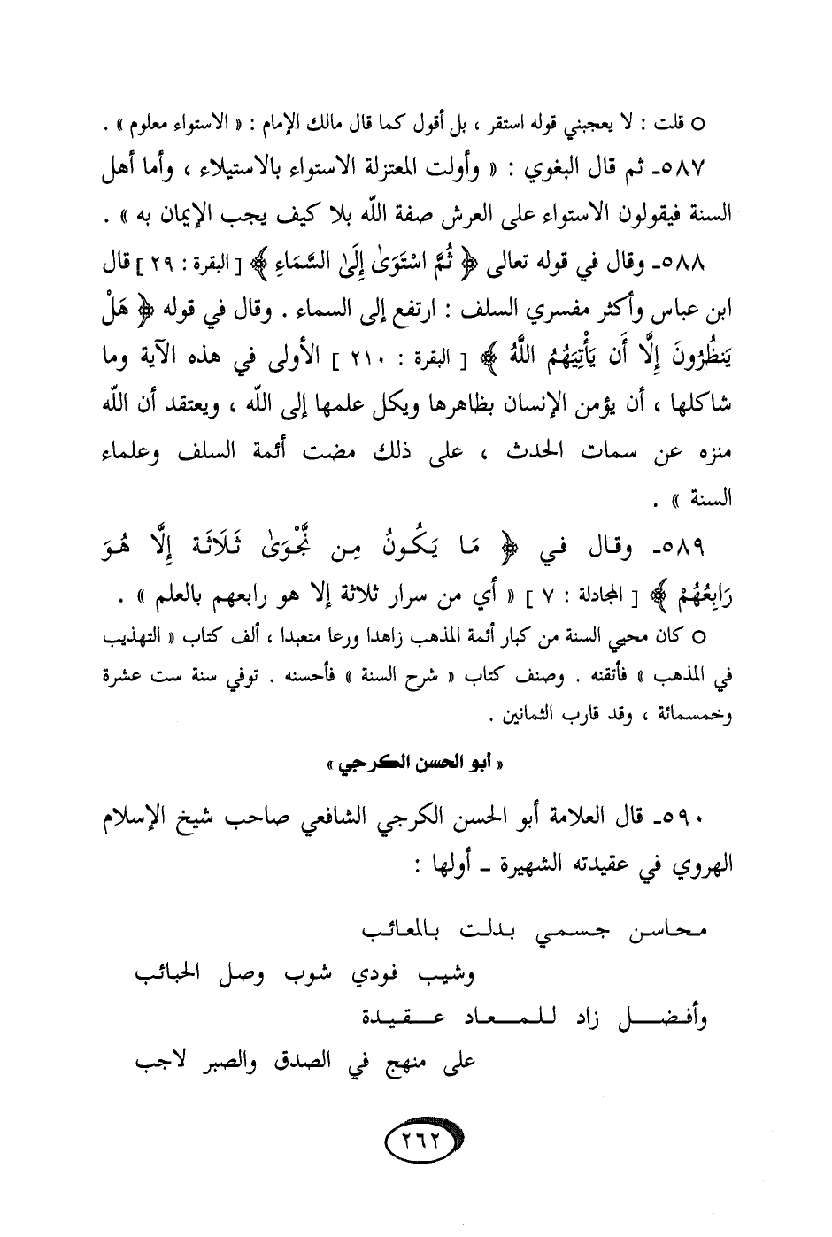 590 - قَالَ الْعَلامَة أَبُو الْحسن الكرجي الشَّافِعِي صَاحب شيخ الْإِسْلَام الْهَرَوِيّ فِي عقيدته الشهيرة أَولهَا